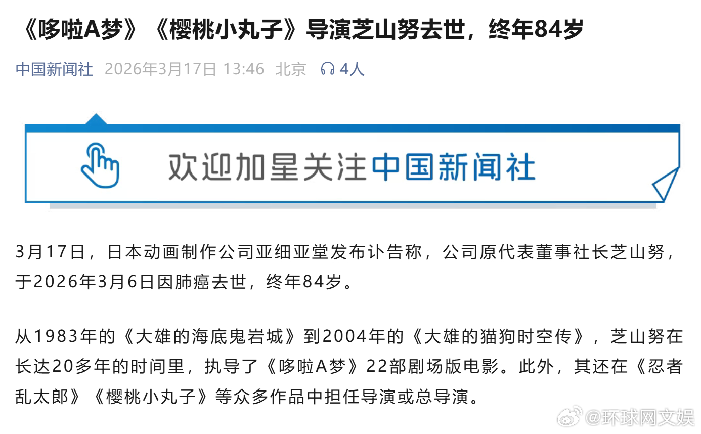 【#哆啦A梦导演芝山努去世# 】据中国新闻社报道,3月17日,日本动画制作公司亚细亚堂发布讣告称,公司原代表董事社长芝山努,于2026年3月6日因肺癌去世,终年84岁。从1983年的《大雄的海底鬼岩城》到2004年的《大雄的猫狗时空传》,芝山努在长达20多年的时间里,执导了《哆啦A梦》22部剧场版电影。此外,其还在《忍者乱太郎》《樱桃小丸子》等众多作品中担任导演或总导演。#樱桃小丸子导演芝山努离世#