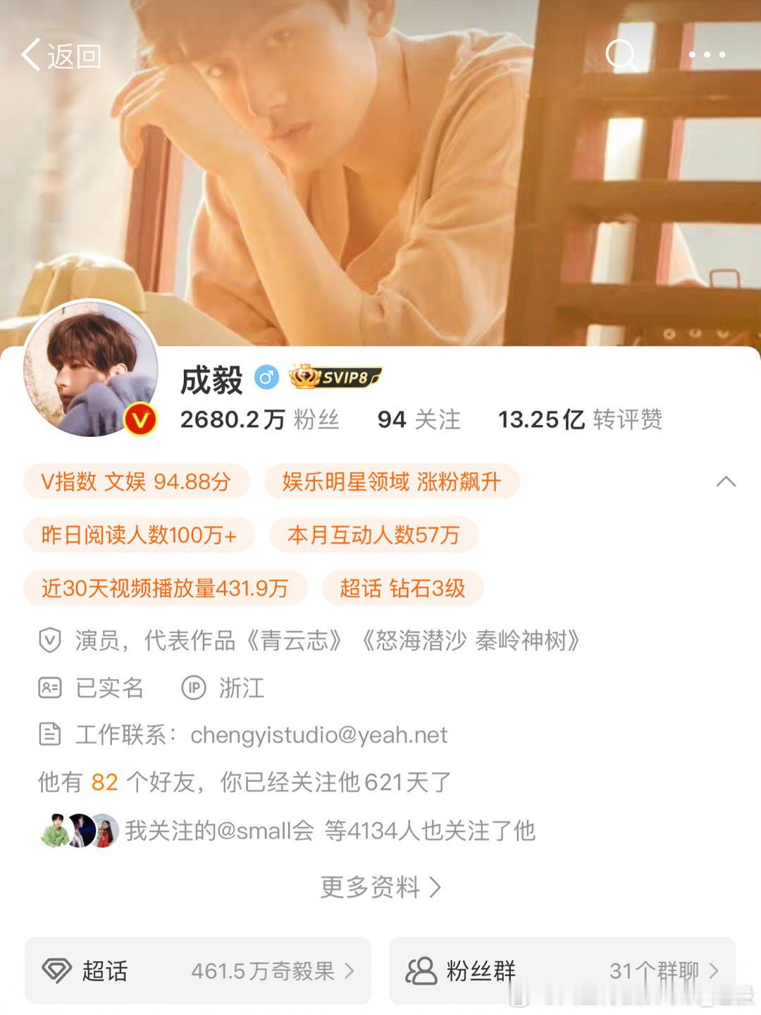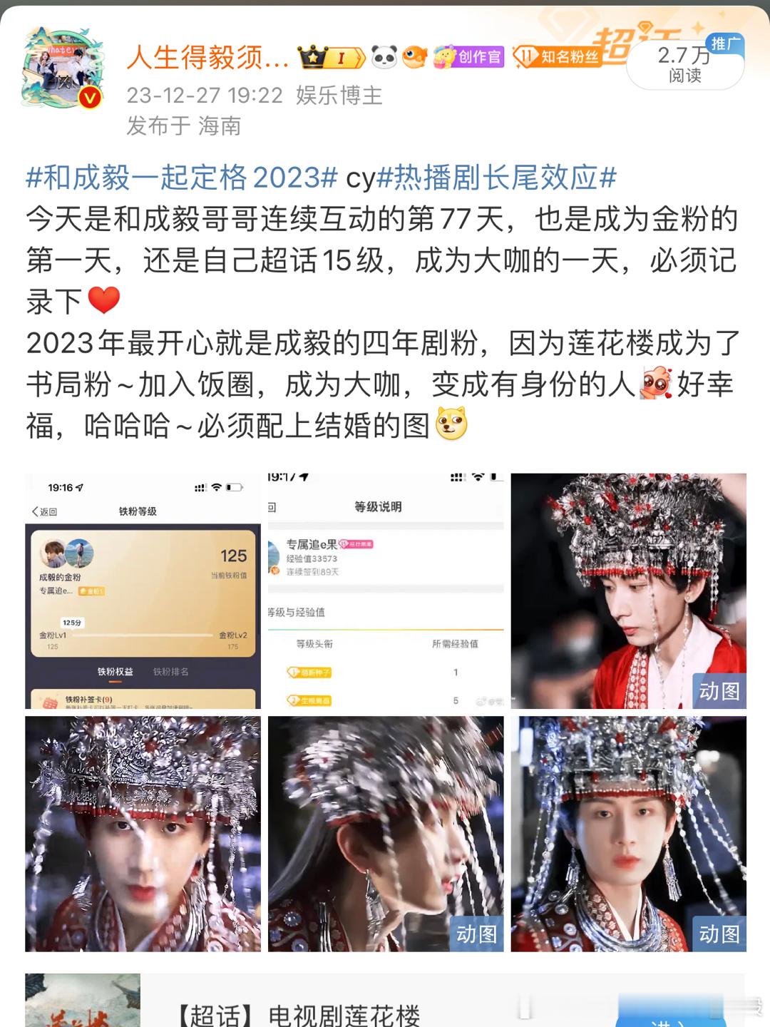 回头看自己发的第一条数据微博是:“超话等级终于6级了”!想想当初的自己,带着一腔热爱,懵懵懂懂的加入饭圈,一心想为这个男人做点什么庆幸自己,没有忘记初心,也没有忘记为何而来,为谁而来!这份爱会一直纯粹着,真的好爱你啊!成毅哥哥~