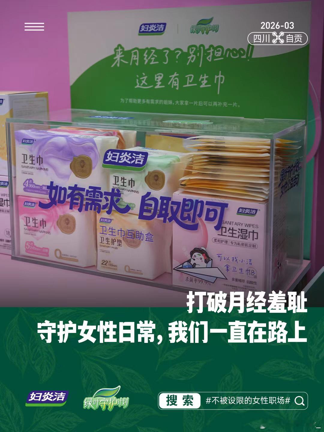 2026三八国际妇女节前夕,妇炎洁这次他们把“绿叶守护计划”第十站带到了四川自贡,没有选在繁华商圈,而是走进了航天产业园和职业技术学院。讲述无人机通讯员不在云端,托举天空,隐形守护安全飞行,女性不被定义的科技职场故事。给航空航天产业一线的女性职工,还有那些怀揣航空梦的女学生,送去了实实在在的关爱——累计40万的捐赠物资,守护女性健康,也托举她们的星辰大海💪
