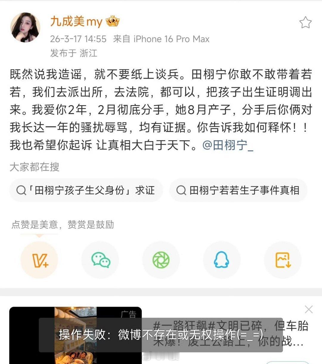 OMG,九成美女士发了她和田栩宁、若若(网传现女友)的聊天记录。田栩宁和九成美两