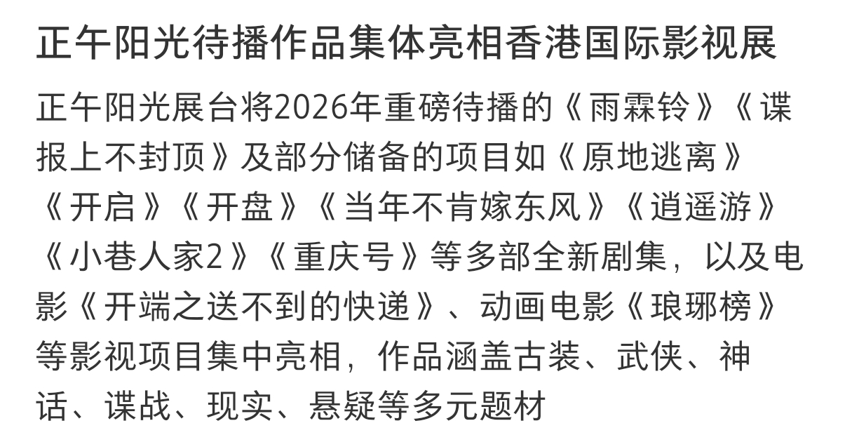 正午阳光待播待拍作品集体亮相香港国际影视展待播剧:《雨霖铃》《谍报上不封顶》待拍剧:《原地逃离》《开启》《开盘》《当年不肯嫁东风》《逍遥游》《小巷人家2》《重庆号》电影:《开端之送不到的快递》、《琅琊榜》