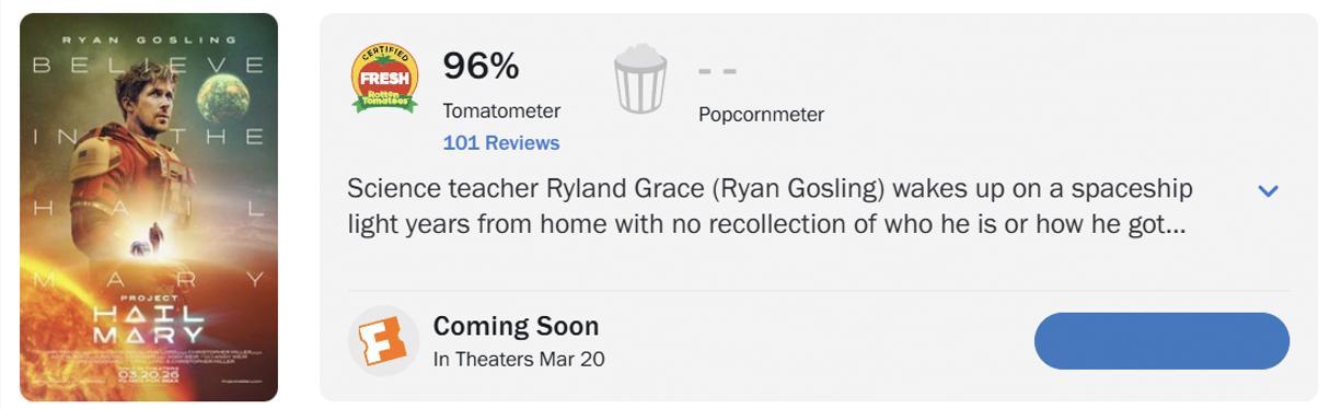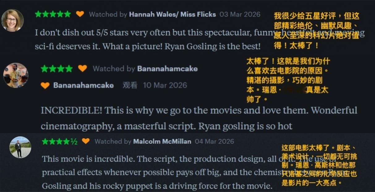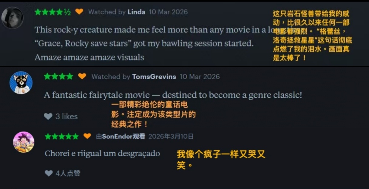 挽救计划(2026) 我的评分:如果说《挽救计划》的灵魂是什么,那答案无疑是洛基。这个外形如同“石头做成的蜘蛛小狗”的外星生命,以其纯粹、忠诚与幽默感,完全捕获我的心。洛基的形象塑造极具匠心。据说制作团队摒弃了全CG的制作方式,采用顶级木偶技法与CG结合,让这个角色拥有了真实的物理存在感。当它的甲壳在星光照耀下泛起微光,当它的肢体在低重力环境下做出细腻的动作,观众能够感受到一种超越特效的真实质感。但真正让洛基深入人心的,是其性格的刻画。这个来自波江座40星系的外星工程师,虽然已经活了数百年,却依然保持着孩子般的好奇与纯粹。他与格雷斯的互动充满了跨物种的妙趣:语言不通时的笨拙试探,科学实验中的默契配合,危急关头的舍身相救。当洛基困惑地看着流泪的格雷斯,问出那句“你的脸在漏水”时,整个影院的观众都在笑声中湿了眼眶。这一刻,科幻不再遥远,而是回归到了人与人(以及人与外星人)之间最朴素的情感连接。挽救计划中国首映礼挽救计划拯救科幻疲劳