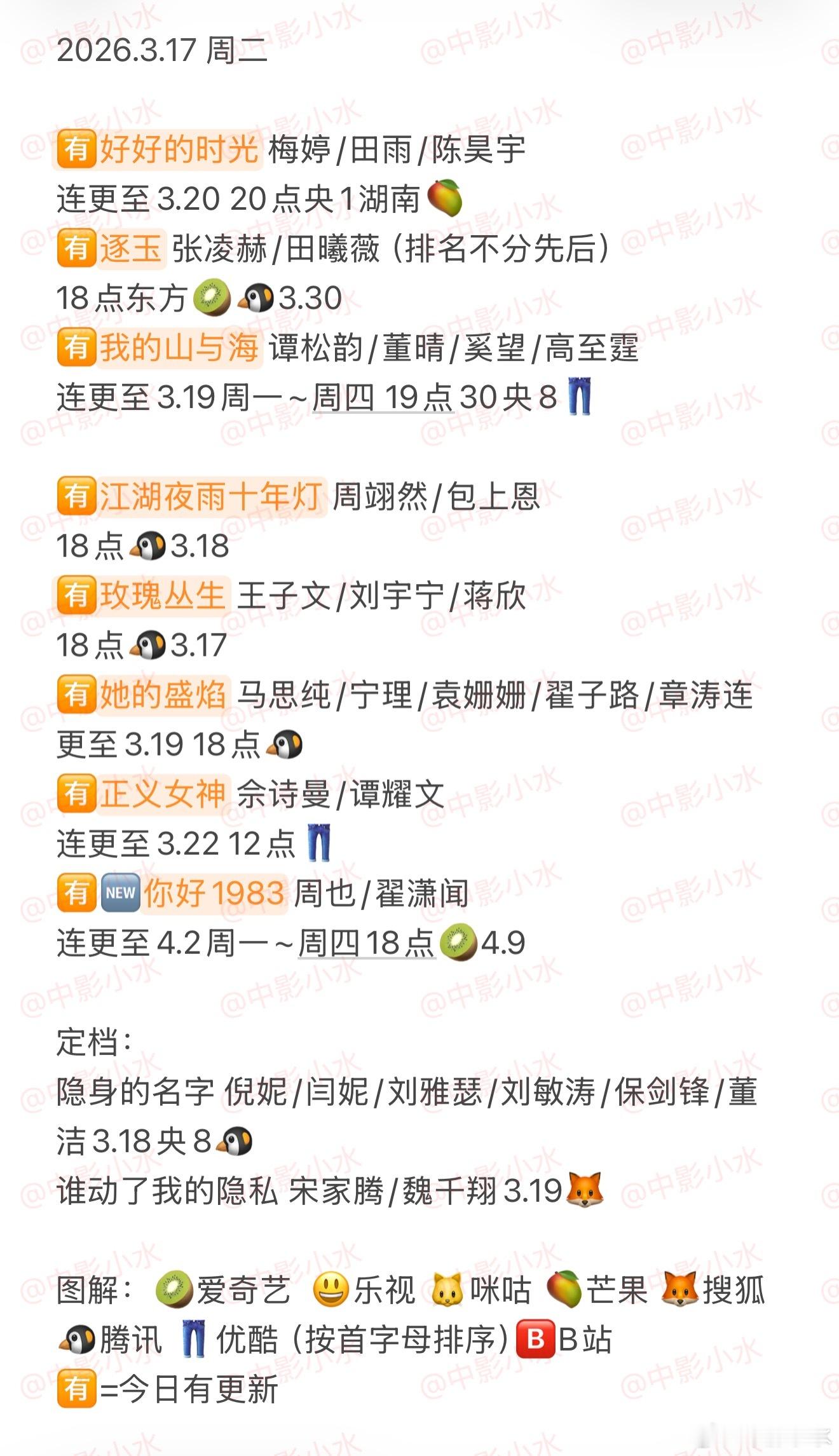 拯救剧荒 3月17日,今晚看点啥??图1 追剧日历 图2 综艺日历 图3 已完结剧集 🈶好好的时光 梅婷/田雨/陈昊宇🈶逐玉 张凌赫/田曦薇(排名不分先后)🈶我的山与海 谭松韵/董晴/奚望/高至霆