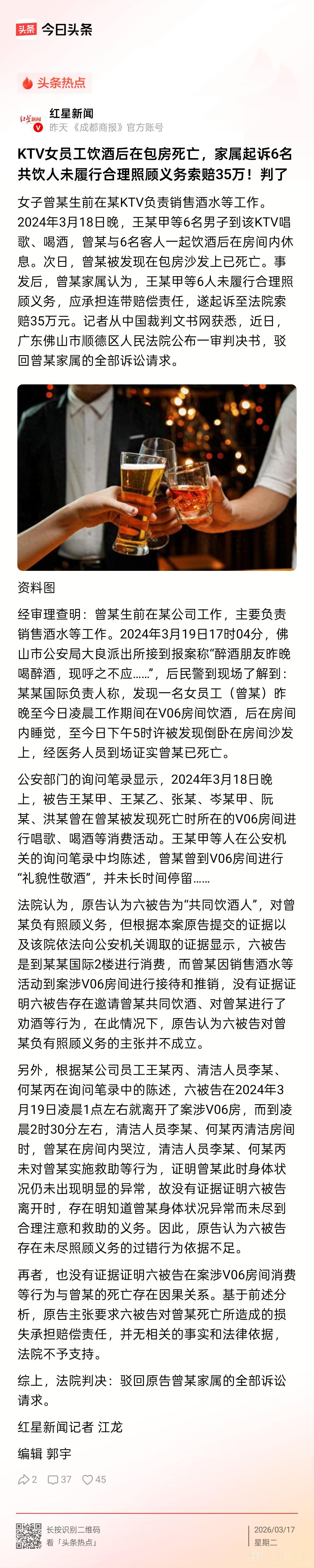 广东佛山,一女子在KTV从事酒水销售工作。一次饮酒后,该女子不幸在包间内离世。女子的家属认为,当天包间里的6名客人把女子灌醉后,未尽到照料义务,这才导致悲剧发生。于是,他们一纸诉状告上了法院,要求这6名客人赔偿各项损失合计35万元。对此,法院的态度很明确。 事情是这样的,曾女士生前在当地一家KTV上班,主要工作就是推销酒水,为了业绩,难免要到各个包厢和客人打招呼、简单敬酒,这也是很多服务行业销售的常态。 事发前一天晚上,有六位客人在V06包厢消费,曾女士按工作流程过去做了简单的接待和敬酒。 大概在凌晨一点左右,这几位客人离开了包厢,和曾女士再无交集。 曾女士可能因为醉酒,在包厢内睡觉。 直到当天下午5时许,曾女士的同事才发现曾女士躺在房间沙发上,已经没有了生命迹象。 面对突然的离世,曾女士的家人难以接受,在悲痛之下,将当晚在包厢消费的六位客人告上了法院,认为他们作为一起喝酒的人,没有对曾女士尽到照顾的义务,理应赔偿。 那么,发生了这样的事,从法律角度来看该如何评价呢? 根据《民法典》规定,行为人因过错侵害他人权益的,应当承担侵权责任。 一般情况下,共同饮酒人因为先前的共同饮酒行为,互相之间具有安全注意义务,即酒后有义务去确保他人的人身安全,对对方进行照料等。 如果共同饮酒人之间未尽到该义务,最终导致悲剧发生,那么等于存在过错,应当承担侵权责任。 在本案中,经查明,六位客人来到KTV正常消费,既没有主动邀请曾女士饮酒,也不存在劝酒、灌酒等行为。 曾女士进入包厢是履行工作职责,与客人之间并非是“共同饮酒人”,客人自然无需承担基于饮酒关系产生的救助义务。 此外,客人凌晨1点离场时,曾女士状态正常;后续清洁人员看到她仅为哭泣,也危险征兆,无法证明6名客人的消费行为与她的死亡存在直接、必然的联系,因果链断裂,赔偿自然无从谈起。 所以最终,法院也就驳回了曾女士家属的全部诉求。 诚然,这个结果,让很多人心里五味杂陈。 于情,我们特别同情曾女士,为了家庭生活奔波应酬,最后付出了生命的代价,家属的痛苦更是旁人难以体会。 但于法,责任不能随便往他人头上乱扣,没有过错就不该担责,这既是对逝者的尊重,也是对普通人的保护。 当然,这件事也给所有打工人提了个醒:工作再重要,也比不上自己的生命和健康。 很多时候我们为了生计不得不妥协,但面对过度饮酒等伤害身体行为的事,我们一定要有底线,懂得保护自己。 对此,你怎么看呢?欢迎大家在评论区留言。(注:图片仅供参考)