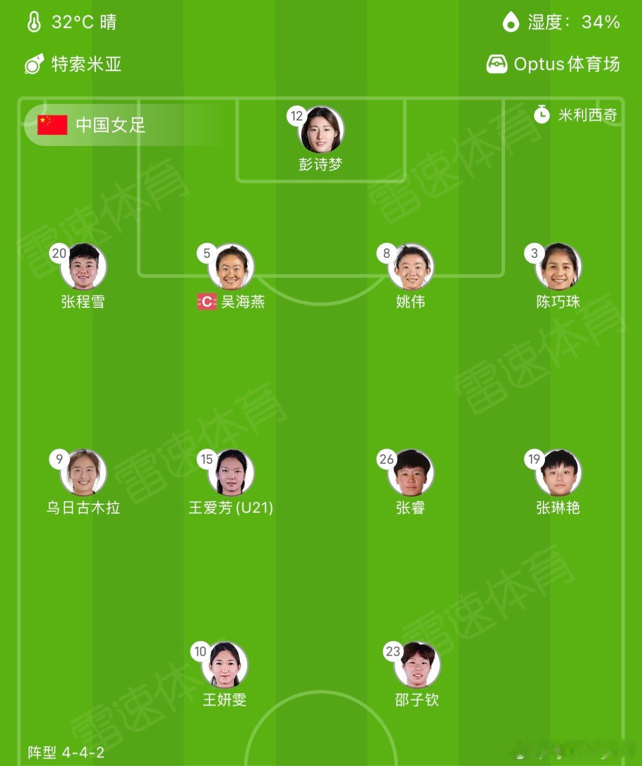 【中国女足】🇨🇳门将: 12-彭诗梦后防线: 3-陈巧珠、5-吴海燕、20-张程雪、8-姚伟中场: 10-王妍雯、15-王爱芳、19-张琳艳、26-张睿锋线: 9-乌日古木拉、23-邵子钦【澳大利亚女足】🇦🇺首发阵容: 门将: 1-阿诺德4-克莱尔·亨特、7-卡特利、14-阿兰娜·肯尼迪、21-卡彭特、8-凯特琳·托佩、19-戈里、23-库尼·克罗斯、9-富德、11-玛丽·福勒、20-萨姆·科尔