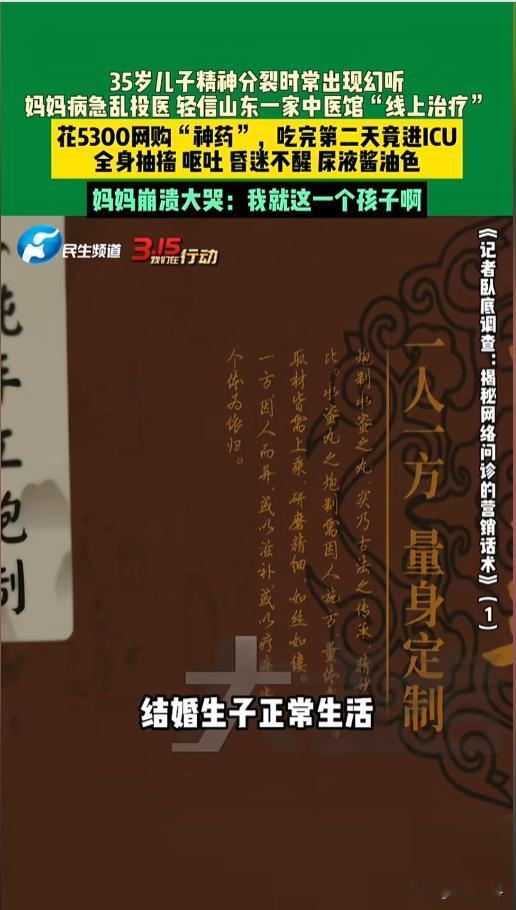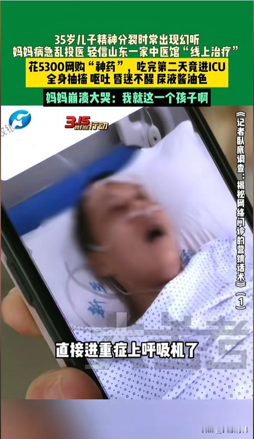 “病急乱投医!”近日,河南新乡,一位妈妈为了给自己儿子治疗精神分裂症,在网上一家中医馆买了5300元的中药,药上竟然一点成分都没标。儿子吃完药的第二天,就开始昏迷不醒,被送进了ICU抢救,妈妈直接崩溃了!网友:可怜天下父母心! 治病最忌讳两点,一点是讳疾忌医,一点就是病急乱投医,无论是哪种心理,都会把自己或他人的健康,推到火坑当中。 据媒体3月13日报道,岳女士的儿子今年35岁了,从20岁开始就颠三倒四,患上了精神分裂症。为了给儿子治病,岳女士没少费心。 最近一段时间,她在网上刷到了一家中医馆,对方声称有“神药”,专治精神分裂症。对方说吃上三个月,她儿子的病就能好,能跟正常人一样生活。岳女士信了,花了5300元,买了七盒中药。 收到药之后,岳女士就迫不及待的让儿子服了下去,结果吃了两天,她就发现了不对劲。儿子开始出现抽搐,甚至昏迷。岳女士大惊,赶紧把儿子送进了医院,没多久儿子就被转进了ICU抢救。 医生说她儿子是中毒,问她给儿子吃了什么药,都是什么成分?岳女士赶紧找来药盒,发现上面就写着一人一方,量身定制,一点成分都没写。她去管中医馆要处方,人家也不给,还扬言“你说是吃我的药中的毒,那就拿出证据!” 好在岳女士的儿子在ICU待了22天之后,脱离了危险。事后,岳女士的家人去了网上那家店的地址,却发现早已人去楼空。经过询问,对方竟换了个地儿又营业了!目前,相关部门已经介入。 网友看后表示,医者仁心,治病救人,不是用来敛财的工具,更不能当儿戏!正是这种不良医生,败坏了中医的名声,让不少人谈医色变,必须得严查到底,还患者一个公道,也还那些好医生们一个公道! 信息来源:《3月13日,河南新乡,35岁儿子精神分裂时常出现幻听,妈妈病急乱投医,轻信山东一家中医馆“线上治疗”,花5300网购“神药”,吃完第二天竟进ICU,全身抽搐,呕吐,昏迷不醒,尿液酱油色,妈妈崩溃大哭:我就这一个孩子》大参考