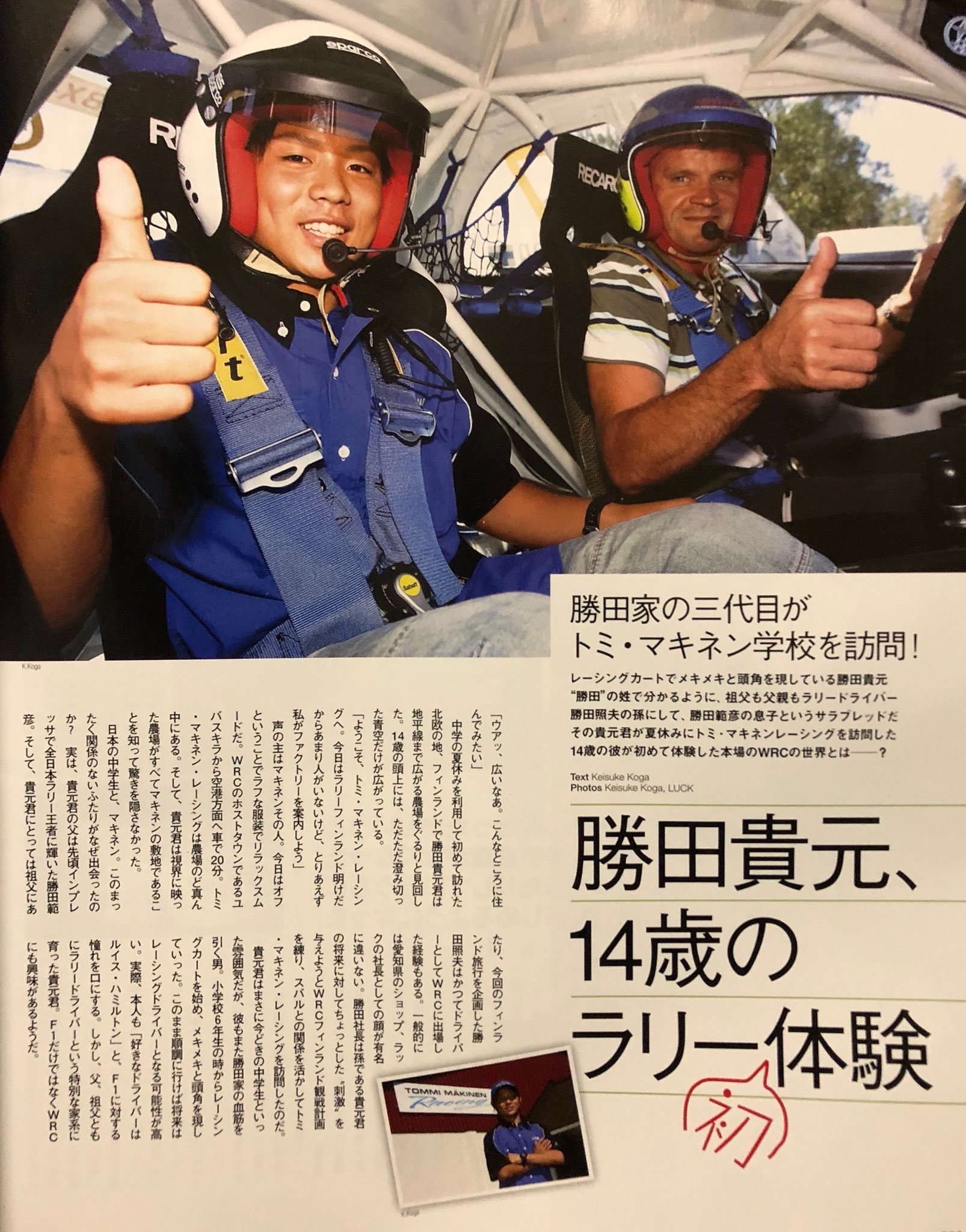 而在8年之后,胜田成为了TGR拉力青训项目的第一期学员,结果又回到了芬兰的于韦斯屈莱并在马基宁的指导下努力成为一个高水平的拉力赛手。胜田自己也提到当时那个感觉相当不真实,就像漫画里的情节一样……
