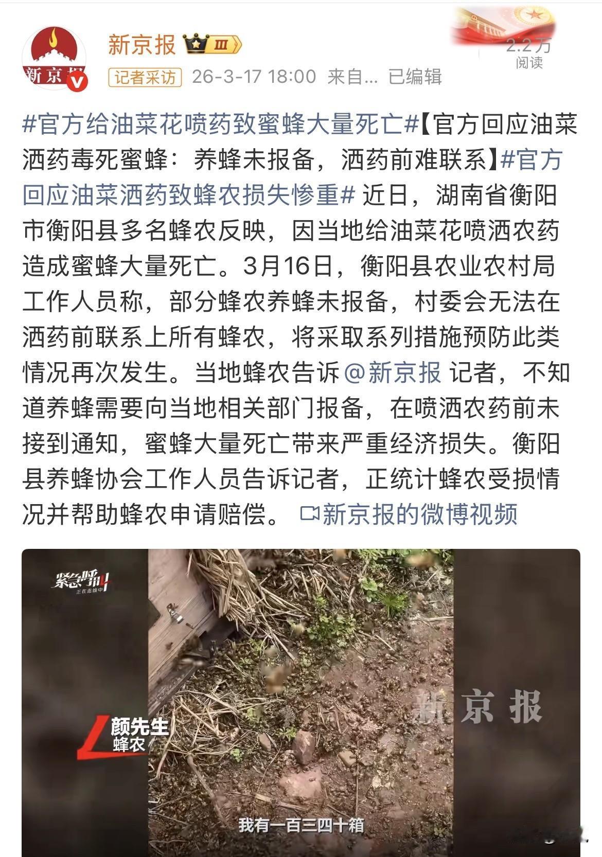 3月16号那天,衡阳县的蜂农老李蹲在田埂上,手里捧着一把黑乎乎的东西。仔细看,全是死蜜蜂。有的翅膀还在微微抖动,像是没断气,但身子已经僵了。他沿着田埂走了几十米,每隔几步就能看见一堆。有些蜂箱门口堆得密密麻麻,跟扫出来的垃圾一样。 老李养了二十多年蜂,头一回见这阵仗。前些天油菜花开得正好,漫山遍野的黄,蜜蜂嗡嗡嗡地飞进去采蜜,那是他一年里最踏实的时候。可那天早上他去开蜂箱,发现不对劲——太安静了。往年这时候,隔着老远就能听见蜂群的声音,那天啥也没有。 后来才知道,乡里组织了无人机给油菜打药,防的是菌核病。老李说,他连个通知都没接着。等看见无人机在天上飞,已经晚了。 县农业农村局的人出来回应了,话说得也直接:部分蜂农养蜂没报备,村委会想通知也联系不上。老李听了这话愣了愣,说这么多年了,每年这个时候把蜂箱拉过来,村里人都认识,谁也没告诉他要报备。他顿了顿,又说,就算要报备,总得有人告诉我们一声吧?我们去哪儿报?找谁报? 老李说这话时没带什么情绪,就事论事的样子,反倒让人听着心里不是滋味。 查了一下衡阳县政务服务网,养蜂确实需要办证,叫“种畜禽生产经营许可证”,办下来要10个工作日,还得提供技术人员、繁育设施、防疫条件一堆材料。老李这样的蜂农,一年到头追着花期跑,春天在湖南,夏天往北走,冬天又往南,哪有固定的“生产经营场所”?让他们按这套流程去办,就跟让流浪歌手去办演出许可证一样,理论上有路,实际上走不通。 更让人想不通的是,就在出事前半个月,衡阳市农业技术服务中心刚发了一期“病虫情报”,白纸黑字写着:油菜花期施药要“最大限度降低蜜蜂中毒风险”,还特别强调“避免使用噻虫嗪等新烟碱类药剂”。也就是说,上面是知道要护着蜜蜂的,文件也下了,要求也提了。可到了村里,这些话就像没写过一样。 为什么非得在花期打药?有农技人员解释,油菜菌核病就靠花瓣传播,必须在刚开花的时候防,晚了就来不及了。换句话说,不打药,油菜可能绝收;打药,蜜蜂可能没命。两边都是生计,就看保谁。 无人机打药效率高,一飞就是一大片,可药雾飘得到处都是,蜜蜂只要沾上就没跑。有蜂农算了笔账,一箱蜜蜂一年能产多少蜜,能繁殖多少新蜂,这一死,损失得按万算。 有意思的是,油菜和蜜蜂本来是个共生关系——蜜蜂采蜜,顺便给油菜授粉,授粉好了油菜结籽多,产量高。可这一打药,蜜蜂死了,授粉没人干,油菜产量也得跟着掉。有专家说,这叫“用药伤蜂、伤蜂减产”的恶性循环。打药的人想保产量,结果反倒可能害了产量。 老李不懂这些大道理,他就知道今年这趟白跑了。旁边几个蜂农凑过来,你一言我一语,有人说要不明天搬走吧,换个地方。老李摇摇头,说这个时候上哪儿找花去?花期不等人。 养蜂协会的人来了,说在统计损失,帮大家申请赔偿。老李点点头,没吭声。他心里清楚,赔偿能赔多少?蜜蜂死了可以数,可这一季的蜜没了,明年繁殖的蜂群没了,这些怎么算? 这事在网上吵得挺凶。有人说蜂农不报备怪谁,有人说村里明明知道有蜂场也不通知,两边都有理。其实细想想,报备也好,通知也好,说白了就是一句话的事儿。可就是这么一句话,两边都没说通,最后全让蜜蜂扛了。 衡阳县今年种了七十多万亩油菜,无人机打药肯定不是头一回,也不会是最后一回。问题是,下一次打药前,能不能有人去田埂边上喊一嗓子?哪怕就在村里大喇叭上吼两声,说后天要打药了,养蜂的把蜂箱挪挪。就这么简单的事,怎么就没人做呢? 你要是老李,这口气你咽得下吗? 来源:新京报