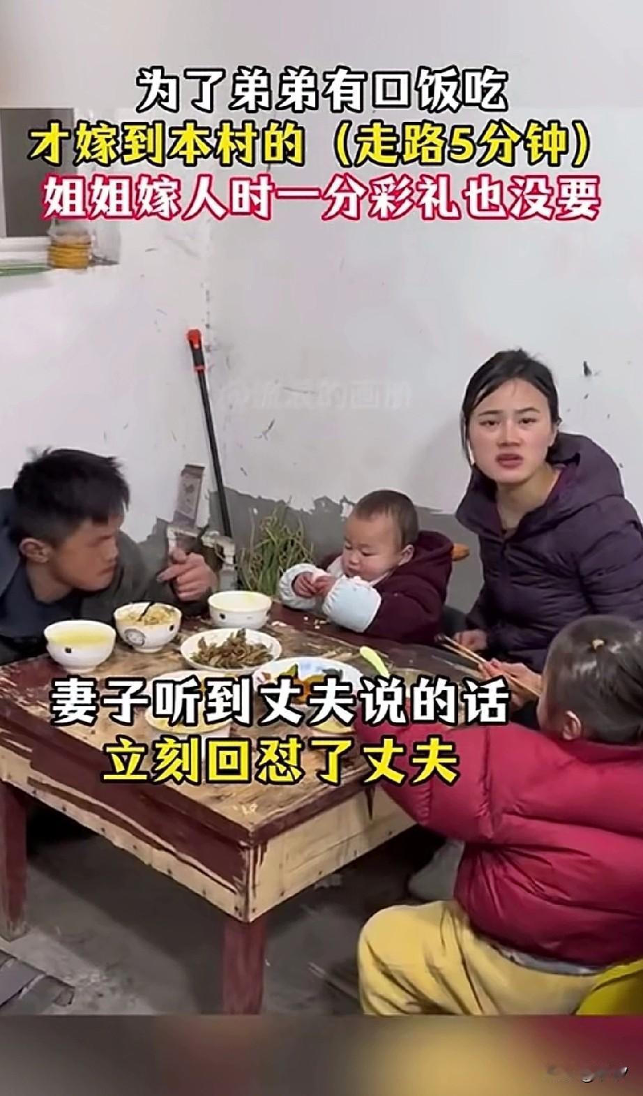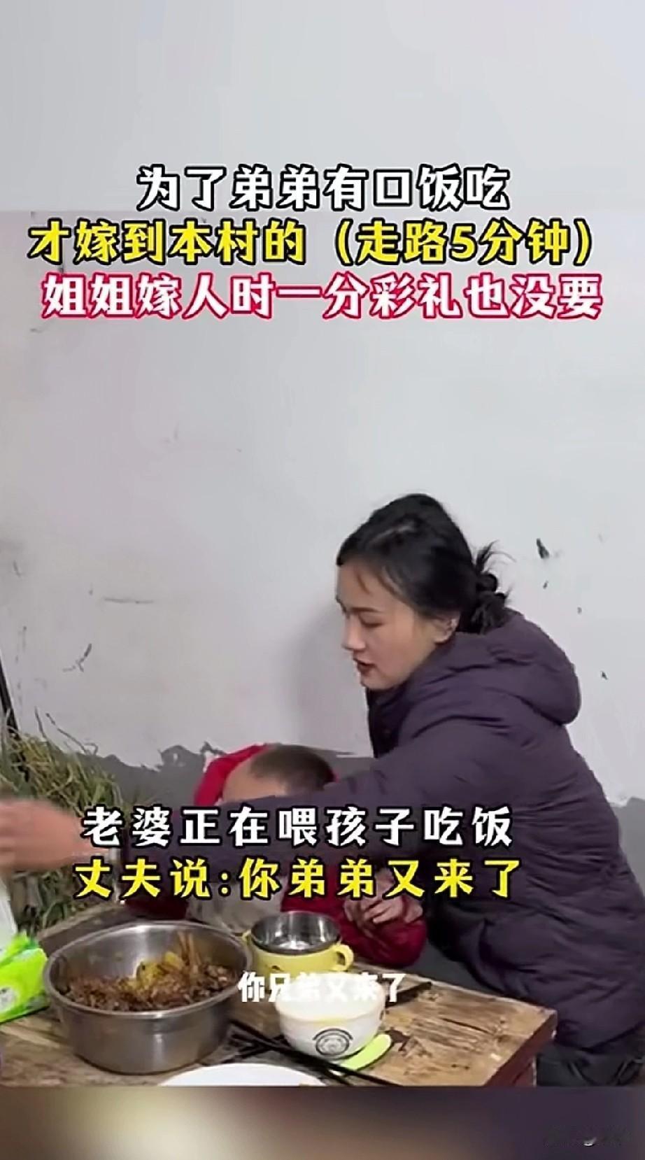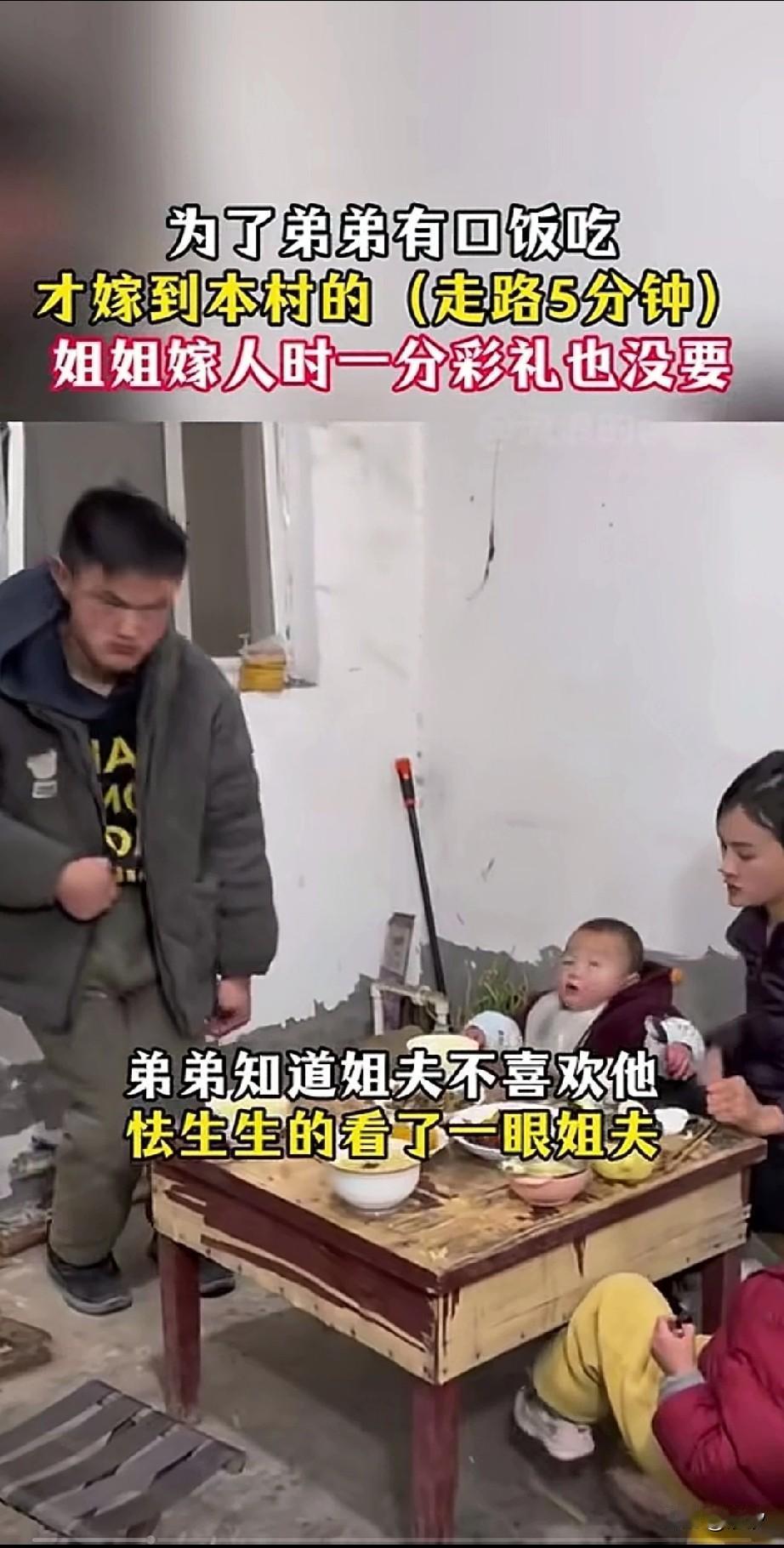 女子在喂孩子饭的时候, 她的丈夫提醒她,你弟弟又来了, 他看到窗户边残疾的弟弟正眼巴巴的看着,女子二话不说就让弟弟进来吃饭, 弟弟一瘸一拐的坐在了桌子旁边, 他不时的看着自己的姐夫, 他知道自己的姐夫不喜欢自己, 妻子不管丈夫的态度, 直接就给他的弟弟盛了饭, 弟弟一直盯着姐夫, 有一种言不由衷的感觉, 丈夫一直说你弟弟一天来八趟, 对他弟弟来这里吃饭充满了愤怒, 妻子直接回怼丈夫, 自己当时嫁给这个本村的丈夫, 没有要彩礼, 就是想让残疾的弟弟来家里吃饭, 为了能让弟弟有一口饭吃, 这个姐姐付出了所有, 如今她不管丈夫说什么, 就直接给弟弟扒饭吃, 说实话,在农村吃口饭, 也穷不了多少, 这个姐夫实在是太小气了, 人家姐姐这么漂亮, 选择嫁给你, 说白了就是不想离弟弟太远, 给残疾的弟弟留一口饭吃, 姐姐照顾弟弟不是应该的吗? 这个姐夫真的实在太小心眼了! 大家对于姐夫不想让残疾的小舅子到他家吃饭这事怎么看? 夫妻相处,最怕的是什么 你们的夫妻吵架是什么样的?