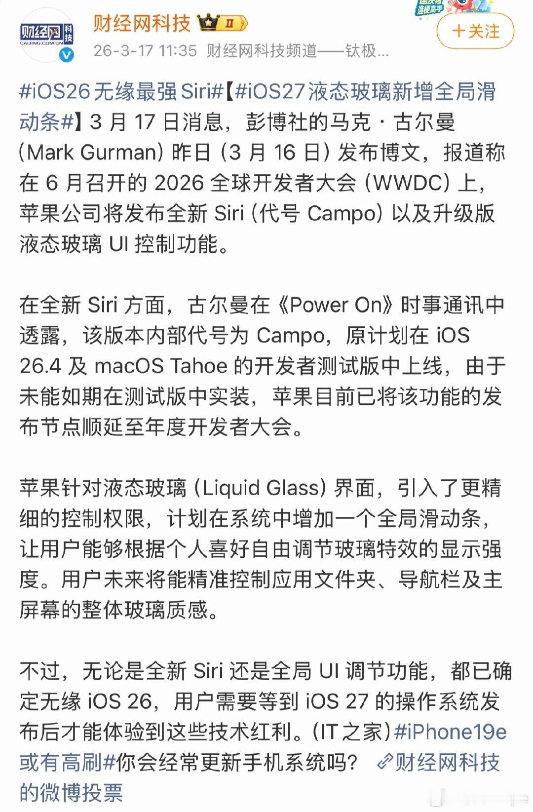 iOS27液态玻璃新增全局滑动条iOS26无缘最强Siri 最强Siri+液态玻璃滑动条 双双跳票原iOS26.4上线,因响应慢、跨应用Bug多,Siri延至iOS27(9月);全局滑动条6月会出现 在WWDC上,期待吗?果子门国行AI更惨用不了Gemini,功能缩水、进度滞后,被华为小米甩开一条街数码闲聊站有点东西