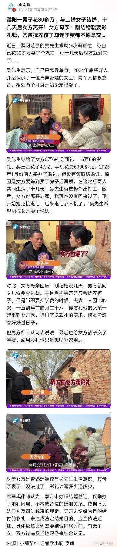 “亏不亏?”河南濮阳,一男子花30多万元娶了一位离异女子,但两人并未领证。怎料,在两人婚后生活了十几天后,女方就直接跑路。男子无奈,只能和父亲找到女方家,要求他们返还彩礼。对此,女方的妈妈则有另一番说辞,认为男子结婚没几天,就想找女儿要回彩礼,还不愿履行此前承诺给女儿的孩子交学费,完全不是好好过日子的态度。 据闽南网报道,吴先生早年间和前妻离异,对其而言,再次成家一直是多年来的心愿,毕竟,这样到老了也好有个伴儿。 2024年底,在媒人的牵线搭桥下,吴先生认识了一位同样离异、独自带着孩子生活的女子。 相似的人生经历,让两人很快聊到了一起,相处起来也格外融洽,仅仅两个月,便正式开始谈婚论嫁。 为了表达诚意,也为了给女方足够的安全感,吴先生按照当地的婚嫁习俗,一笔笔向女方付款:6万6的见面礼、16万6的彩礼,再加上价值4万2的三金和六千多元的新手机。 对于普通打工者而言,这几乎是他全部的家底,可吴先生毫无怨言,觉得能娶到心仪的人,一切都值得。 2025年1月,两人热热闹闹举办了婚礼,可却一直没有领取结婚证。 而女方给出的理由是,要等两人买了房子,有了安稳的住所后再领证。 吴先生虽有疑虑,但也不想因为这件事伤了感情,便点头答应了下来。 婚礼过后,为了赚钱,吴先生再次收拾行囊外出打工。 可他刚离开老家不久,女方也随之离去,从此再也没有回来。 起初,吴先生打电话、发消息,对方还会偶尔回应,可慢慢的,电话不接、信息不回成为常态,直至彻底断了联系。 花光所有积蓄娶回家的人,就这样凭空消失,这让吴先生非常生气。 于是,吴先生找到记者,并在其陪同下,来到女方家中,希望得到一个说法。 可女方母亲却表示,两人的婚姻早已无法继续,问题全在吴先生身上。刚结婚没几天,吴先生就开始向女儿索要彩礼钱,当初明明答应会好好抚养孩子,可到了孩子交学费的时候,两人却为此大吵一架。 不仅如此,吴先生还和他父亲在腊月二十八还一起上门,直接提出要退还彩礼,丝毫没有好好过日子的打算。 对于女方家人的指责,吴先生十分无奈。他解释说,自己并非不愿抚养孩子,孩子的学费最终也按时缴纳了,提起彩礼也只是想贴补家用,并非是恶意索要。 事到如今,女方母亲也明确表示,这段婚姻已经没法继续,彩礼该退多少就退多少。 这件事在网上曝光后,也引起了网友们的热议。 有人觉得,吴先生真心付出却人财两空,女方同居十几天就失联,明显缺乏诚意,彩礼无论如何要全部退还; 也有人认为,二婚重组家庭本就有很多容易产生矛盾得风险,两人都没做好应对风险的准备,就草率结婚,结果可想而知。 其实,对于吴先生而言,两人走到这一步也并不算意外。 两人因相亲快速走到一起,在没有足够的时间了解彼此的情况下,就快速决定踏入婚姻。 然而,譬如房子、孩子等诸多现实问题,双方又没有在婚前商量好,无疑会带入婚姻当中,再加上没有结婚证的保障,这段仓促开始的婚姻,最终只能潦草收场。 对于吴先生而言,如今只能及时止损,根据《民法典》及相关司法解释的规定,其和女方尚未领证结婚,且共同生活时间较短,可以要求对方返还全部或绝大部分彩礼。 不过,对于吴先生举办婚礼及一些其他的花销,由于不具有彩礼的性质,吴先生也只能自己承担了。 总之言之,还是那句话,婚姻不是儿戏!无论是头婚还是二婚,大家都不能因为一时冲动就匆忙做决定,更不能把金钱和利益摆在感情前面。 唯有双方互相尊重、坦诚相待,用心经营双方的感情和规划未来,婚姻才能走得稳、走得远。 对此,你怎么看呢?欢迎大家在评论区留言。