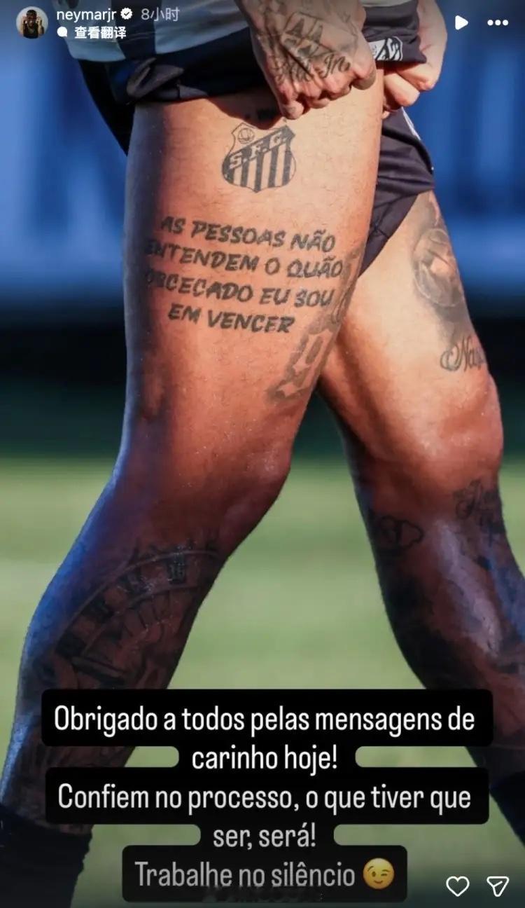 3月17日讯 内马尔落选了巴西最新一期友谊赛名单,他此前在社媒对此表达了失望与难过。这位巴西球星再次更新社媒向关心他的人表达了感谢。内马尔社媒照出大腿的纹身照,大腿上的文字纹着:“人们不明白我有多么执着于胜利”。社媒图片中写道:“今天感谢大家发来的暖心信息!相信过程,该来的总会来!默默努力