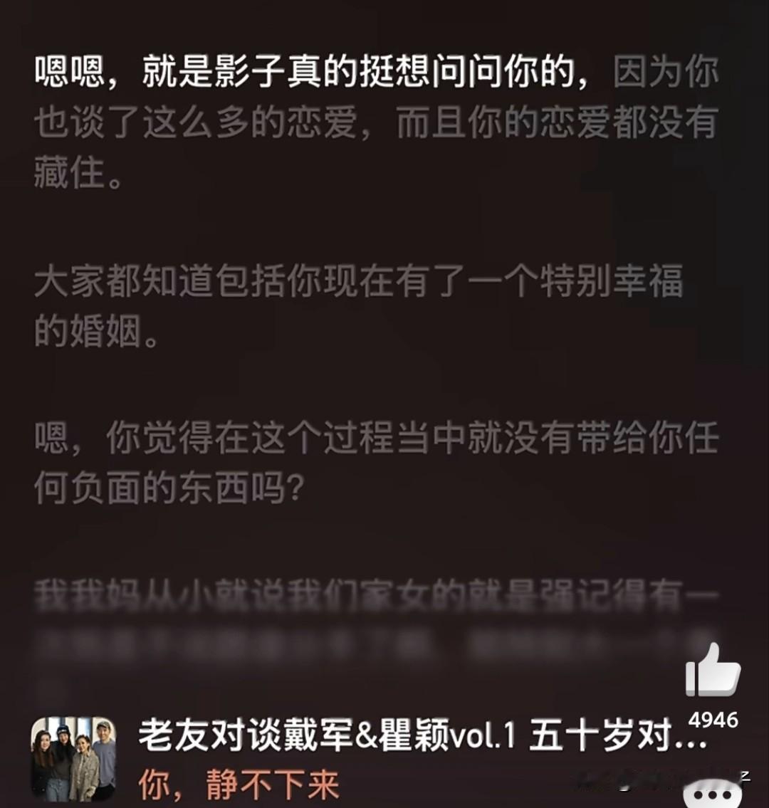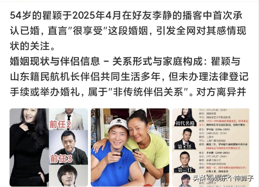 我滴乖乖!瞿颖已经结婚了吗? 3月17日,瞿颖上了热搜,这一次,不是因为再次翻红,而是关于“瞿颖已婚”的词条,瞬间引发热议。 事情的起因,网友发现瞿颖在2025年参加好友李静的节目,透露自己已婚。 听了网上晒出的一段录音,面对好友李静提问(特意说了你现在有了特别幸福的婚姻),瞿颖并没有反驳,而是表示很享受现在的生活。 不过,在网上搜索,显示瞿颖依旧是未婚的状态,这……,有点一头雾水,印象里,也确实没有官宣过。 回顾瞿颖的四段恋情,全部以失败而告终,对方都是实打实的帅哥,可惜了。 过年期间,李静前往泰国清迈与戴军一起聚会,当时,好友晒出的照片中,也看到了去瞿颖的身影。 当然,现在想想,瞿颖以前发布的动态,确实可以看出一些蛛丝马迹。 另外,瞿颖和胡兵经常互动,网友眼中,两人非常般配,实际上却是多年的好友,如此看来,也可以理解了。 不管怎么,正如瞿颖所说,很享受现在的生活,自己开心就好。