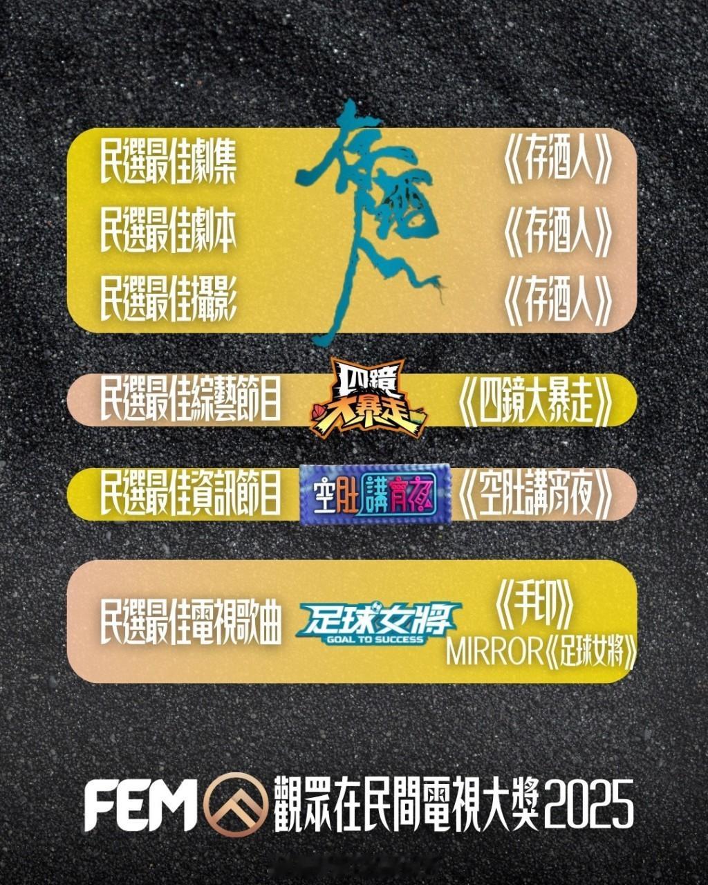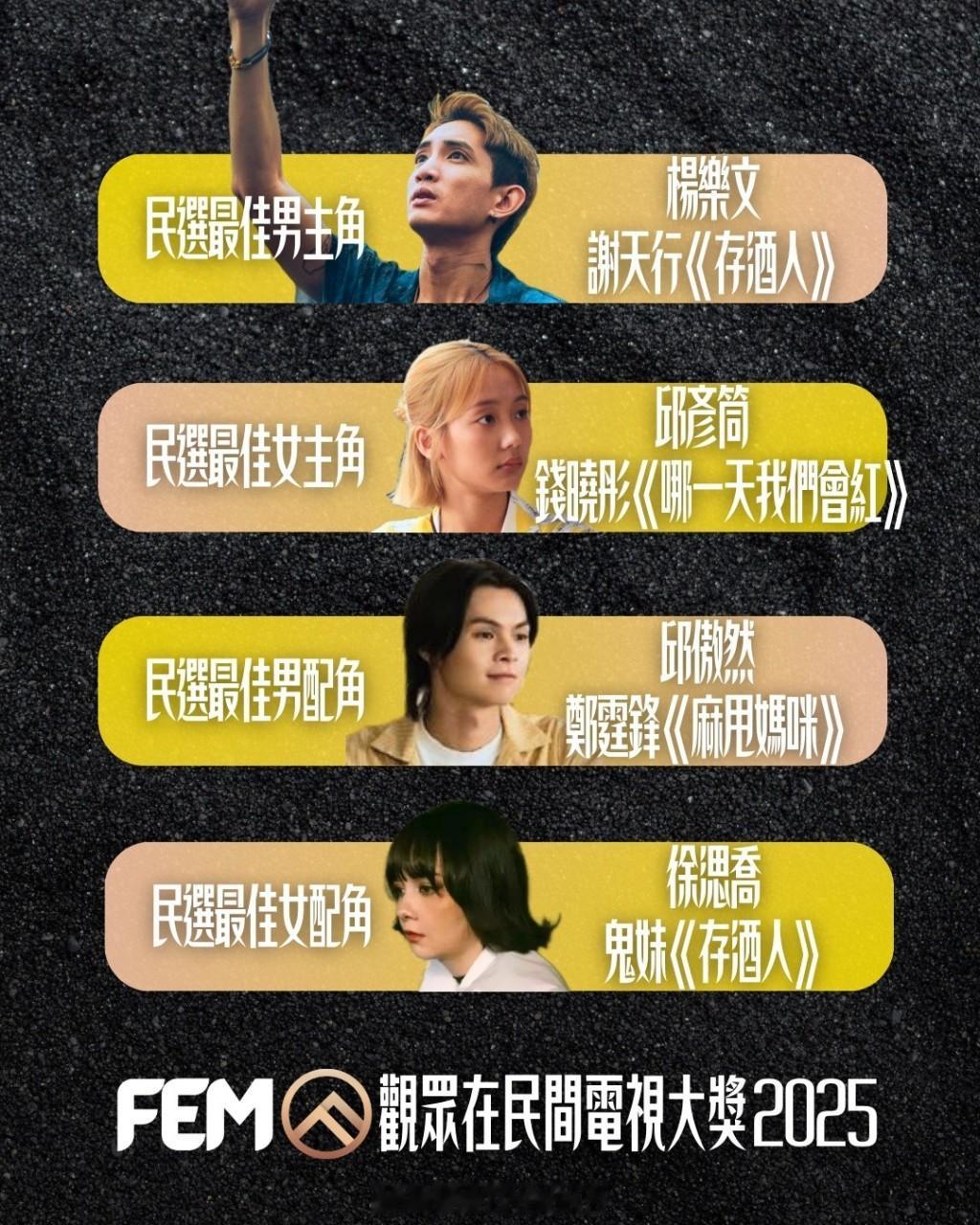 《存酒人》共得6项民选奖项成为大赢家除了杨乐文成为民选视帝外,在《存酒人》饰演“鬼妹”的徐㴓乔夺得民选最佳女配角、杨乐文与邱傲然(Tiger)夺得民选最佳戏剧拍档,连同得到最佳剧集、剧本、摄影大奖,《存酒人》共得6项民选奖项成为大赢家。民选最佳女配角竞争激烈,龚慈恩出现“自己打自己”局面,最后以《新闻女王2》“方罗丽嫦”一角屈居亚军(267票),另一角色《金式森林》“蒋焕秋”夺第六名(160票)。两者票数相加为427票,比徐㴓乔《存酒人》“鬼妹”一角所得385票多出42票。民选最佳男配角由邱傲然凭《麻甩妈咪》“郑霆鋒”一角夺得,继上届《打天下2》“戴凯天”后连续两届夺得此奖项,罗子溢《金式森林》“高深”夺得民选最佳男主角第五名。