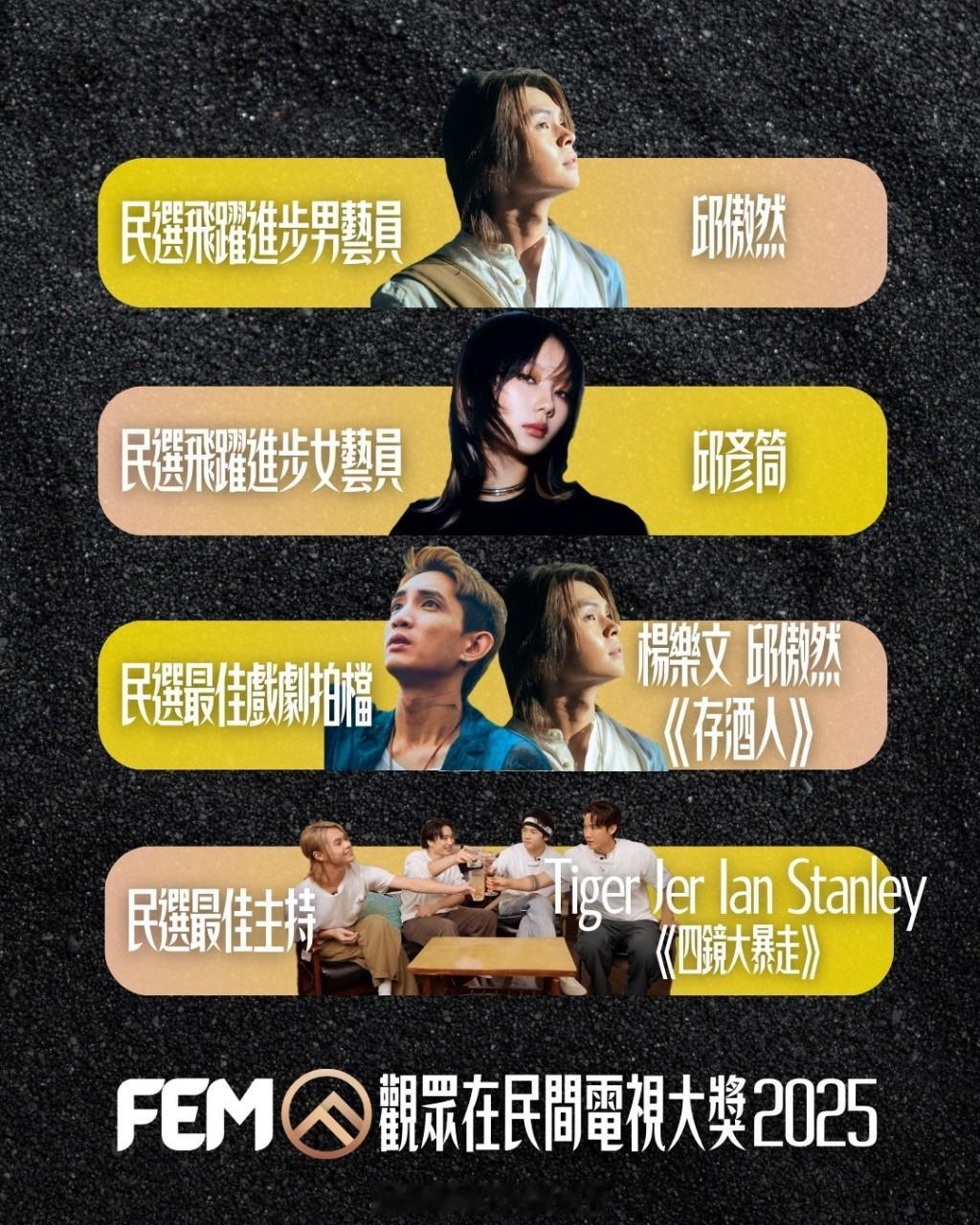佘诗曼去年承接《新闻女王》的气势,凭《新闻女王2》在《万千星辉颁奖典礼2025》囊括“最佳女主角”、“大湾区最喜爱TVB女主角”以及“北美最喜爱女主角”,佘诗曼再次成为三料视后,也成为TVB电视史上首位四届视后,破了自己的记录,网民支持佘诗曼实至名归,她的事业再创高峰。网络平台“方以文一个人写光影”举办第10届“观众在民间电视大奖”昨日(17日)公布赛果,结果竟然令人大感意外。
