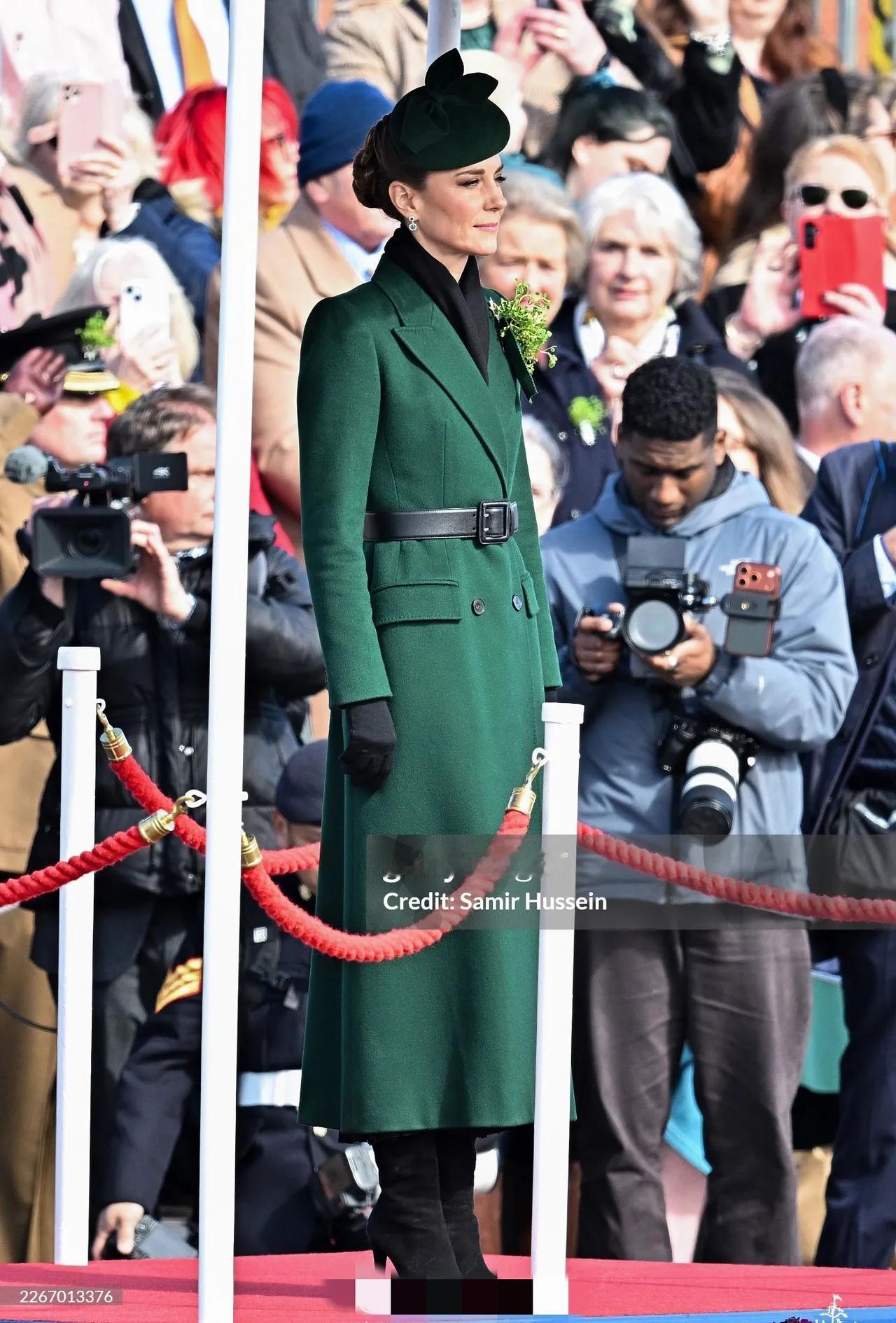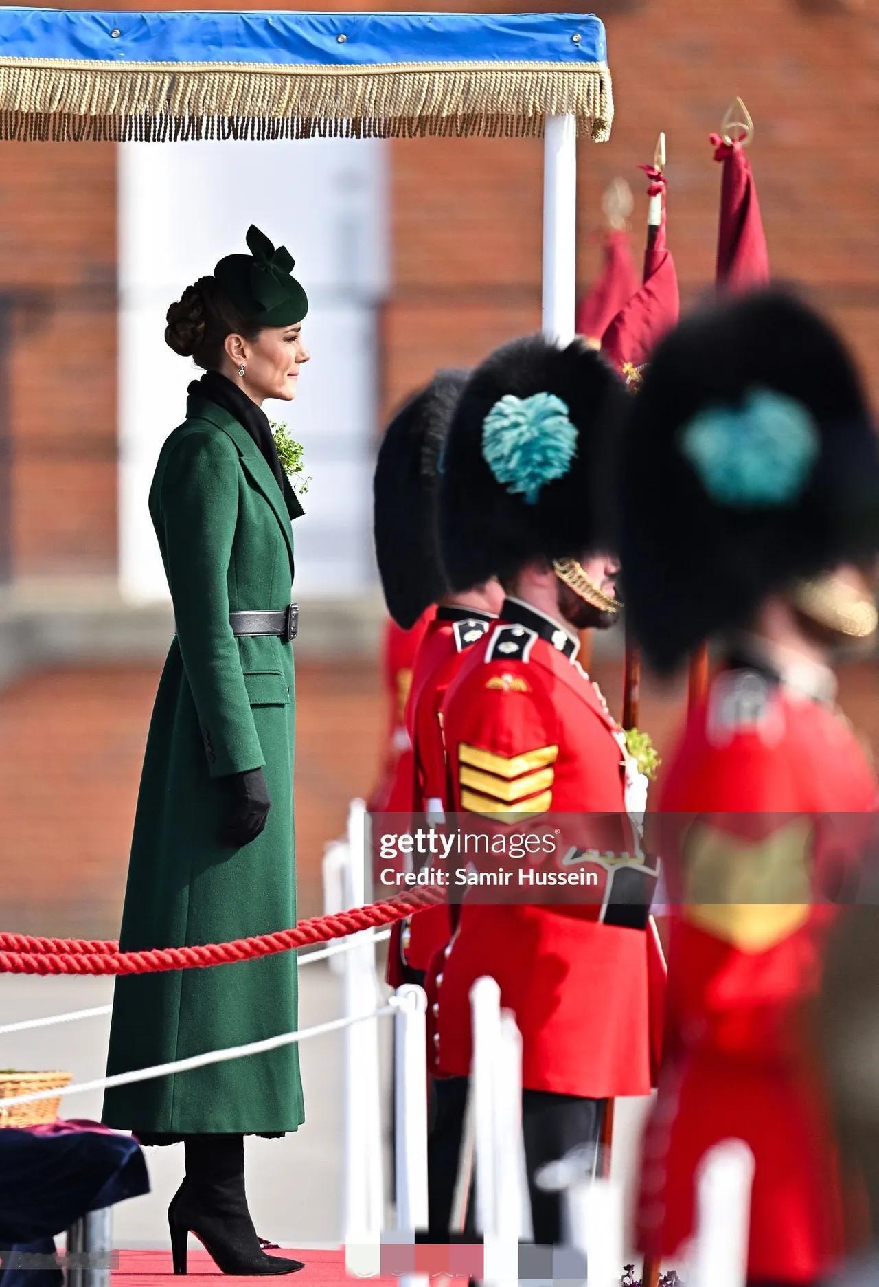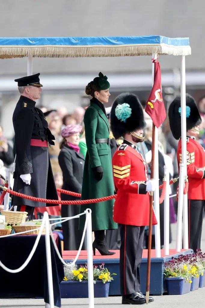 凯特王妃以上校身份站高台阅兵,气场强大! 今天,凯特王妃再次以爱尔兰兵团上校的身份出席一年一度的圣帕克节巡游活动! 虽然是上校,但是凯特却并没有穿军装,一身森林绿大衣,和过去十几年每一次参加这场活动的造型一样,也都是绿色系。 凯特王妃优雅端庄,以往出席活动,总是让人觉得亲和力十足。 但是作为兵团上校,凯特王妃站在高台检阅士兵,身姿笔挺,英姿飒爽,真是相当有气场,好有范儿啊!