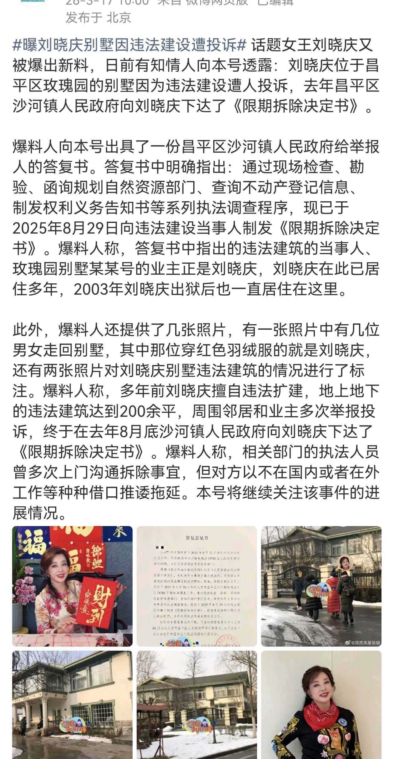 3月17日,刘晓庆又被爆料了! 有知情人称:刘晓庆位于北京市昌平区玫瑰园的别墅涉嫌违建,遭投诉后,去年8月被责令拆除。 相关部门执法人员多次上门沟通拆除事宜,刘晓庆方都以人不在国内或在外工作等种种借口,多次拖延不执行。 爆料人称,多年前刘晓庆擅自违法扩建,地上地下的违法建筑达到200余平,周围邻居和业主多次举报。 爆料人还附加了照片,其中一张里穿红色羽绒服的刘晓庆走回别墅的画面,称刘晓庆在此居住多年,2003年出狱后也经常居住在这里。 另外还有两张照片则标注了违法建筑的具体位置和情况。 刘晓庆这次因违法建设陷入舆论漩涡,后续拆除事宜会如何进展,该爆料人将会持续关注。 不过有网友表示:“这个地方的问题挺复杂的,很多都是“历史遗留问题”,有类似情况的不止刘晓庆一家。 刘晓庆出狱后曾在采访中说:“我原来有28个房子,27个房子都拍卖充公了,我从来没有掉过一滴眼泪,再重打江山就是了。” 不知道这套别墅是不是刘晓庆口中的那一套。 刘晓庆,23岁,红遍全国! 31岁,成为春晚历史上首位女主持人。 48岁,因为税务问题入狱,债务累累。 蹲了422天监狱的刘晓庆刑满释放,走出看守所的照片,至今仍是娱乐圈最具张力的瞬间之一。 后来的故事大家都知道了,凭借着不服输的韧劲,刘晓庆重返演艺圈,当群演、拍戏、经商、收藏翡翠,一步步东山再起,事业重回正轨。 如今75岁的刘晓庆,直播、带货、拍短剧、上综艺,26年还没过一个月,平均3天上一次热搜,热度超高。 不知道这件事是否会对刘晓庆26年的工作计划造成影响。 对于这件事大家怎么看呢?一起蹲一个后续吧!