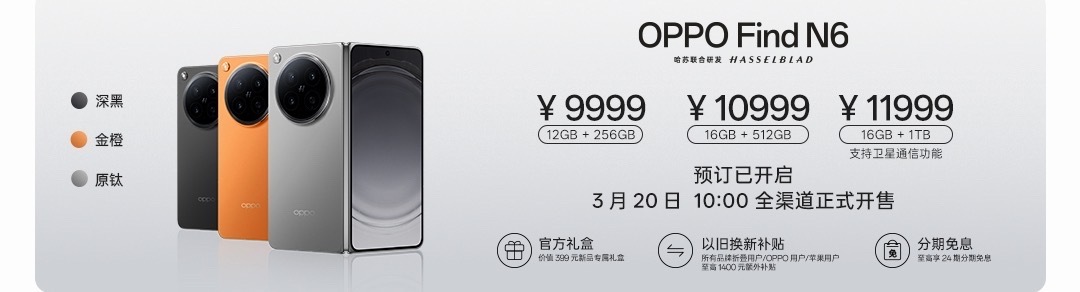 OPPO这次把折叠屏的“折痕焦虑”按在地上摩擦!Find N6 用钛合金天穹铰链+天穹记忆玻璃,开合起伏0.1mm,折痕99.9%自修复,还拿下德国莱茵TÜV 60万次折叠+无感折痕认证。屏幕方面,8.12英寸内屏+1nit明眸护眼+1800nits峰值亮度,外屏也一样明亮,配上哈苏2亿超清四摄、潜望长焦、丹霞色温,旅拍拿着就能出大片。高通第五代骁龙8至尊+6000mAh冰川电池+80W/50W双闪充,再加AI手写笔、高级分屏、AI一键闪记,办公、创作都是顺手且高效。价格上,12+256GB 9999元,16+512GB 10999元,16+1TB 11999元起。