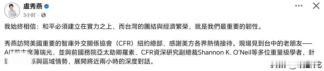 “倚美谋独”? 卢秀燕:和平必须建立在实力之上。 卢秀燕见了一些老美智库的高层谈了一些问题,就开始在社交平台发文谈实力了。 对此我特别想问你什么实力?你想要什么实力? 你12月分就要卸任了,到时候谁还记得你?别妄想2028的事情了,还早得很,加上去年国民党那么多人希望你站出来扛大旗担责任选国民党主席,你偏端着,装高深莫测,就是不同意,现在又在老美那边说什么和平必须建立在实力之上,真的合适吗?够格吗?你能代表谁?真要是优秀的市长就该谈如何让台中市民过得更好,让台中市发展更好,而不是跑到老美那边作秀,大谈国际局势和政治。 另外,卢秀燕贴文中有错误的不合适的用词,也难怪有网友用“倚美谋独”来形容。她还扯到什么“把台湾真实的声音带出去,把国际最精确的观点带回来。” 我看了都替她尴尬,太把自己当回事了。去了一趟美国见了几个人就认为那是“国际最精确的观点”,你在开什么“国际玩笑”?而你也代表不了整个岛内的声音,你甚至都不知道岛内真实声音是什么。他们希望工资提升,过上好日子,需要和平,两岸友好相处,多多交流,卢秀燕除了亲美还会啥?来过大陆吗?善意有吗?希望蓝营和蓝营支持者多多反思这些问题。