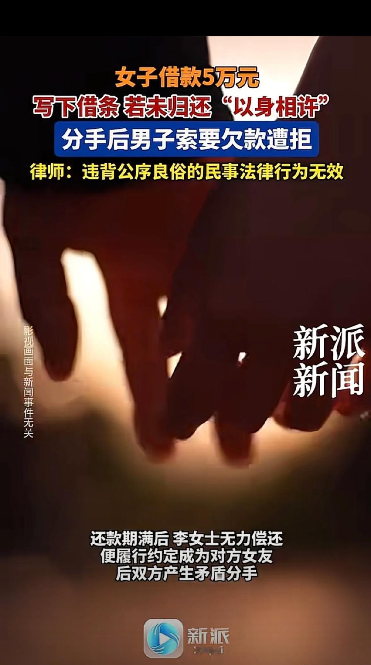 “白嫖成功了?”一女子管男子借5万,男子开出条件,如果女子到期还不上钱,就得做他女朋友,女子答应了,到了还款日,女子拿不出钱,就按约定和男子处起对象,但2人没有感情基础,没多久就分手了,男子立马翻脸不认人,要求女子还钱,可女子认为自己已经履行承诺,那笔账应该一笔勾销。 事情真的又荒唐又现实: 李女士手头缺钱,张口找朋友张先生借5万块。 张先生抹不开面子借钱,却提了个极度奇葩的条件:到期还不上钱,就必须做我女朋友! 急着用钱的李女士想都没想就答应了,心里还打着小算盘,先拿钱再说。 结果还款日一到,她一分钱都拿不出来,只能硬着头皮履行约定,搬去和张先生同居谈恋爱。 可没有感情基础的捆绑,全是鸡飞狗跳! 张先生觉得钱花了,对李女士指手画脚; 李女士觉得自己“以身抵债”,满心委屈憋屈。 俩人天天吵、事事闹,没过多久就彻底分手。 万万没想到,分手之后张先生直接翻脸,追着要5万欠款; 李女士更理直气壮:我都按约定当你女朋友了,这笔账早就一笔勾销,你还好意思要钱? 直接把张先生气到堵门追债,场面尴尬到极点。 这事一出,网友直接吵翻了👇 ❶网友辣评:这女的纯纯想白嫖!借钱还钱天经地义,谈恋爱是你自己答应的,凭啥抵欠款? ❷网友吐槽:这男的也不是好人!借钱搞这种霸王条款,拿感情当交易,吃相太难看! ❸网友清醒:俩人情商都掉线,拿人身关系抵债,本来就违背常理,注定闹掰! 我真的要敲黑板提醒所有人:法律根本不认“以身抵债”这一套! 按照《民法典》规定,把恋爱、同居当成债务偿还条件,属于违背公序良俗,这个约定从一开始就是无效的! 但借款是真的、借条是真的,合法借贷关系受法律保护。 也就是说:李女士就算同居过、谈过恋爱,这5万块钱一分不少,必须还! 说白了,别拿感情当交易,别搞奇葩抵债套路,既丢了体面,又逃不掉法律责任,最后只会两头空! 你们觉得这5万到底该不该还?男方提的条件合理吗?评论区大胆说!