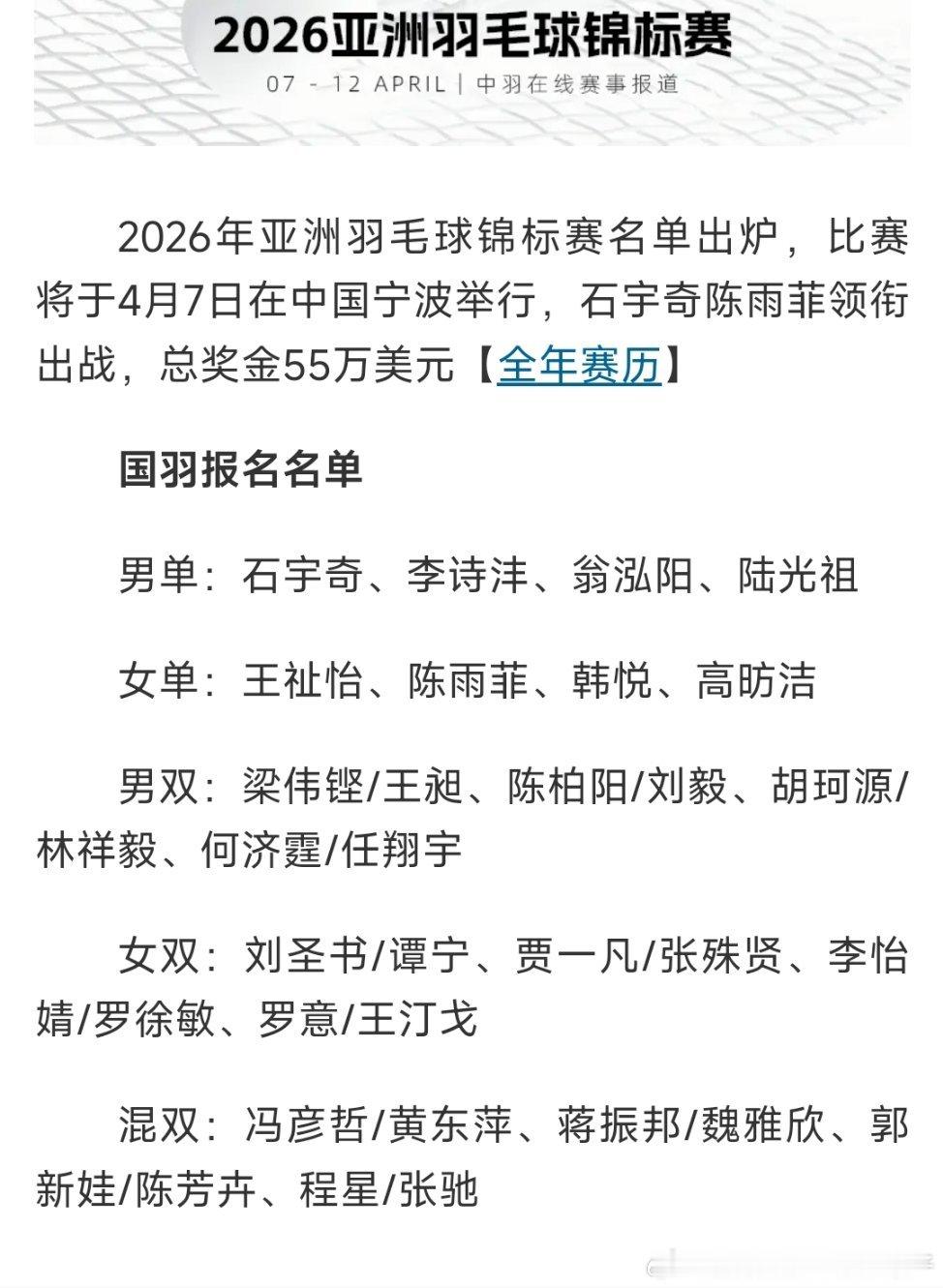 2026年亚洲羽毛球锦标赛国羽报名名单:4月7日-12日男单:石宇奇、李诗沣、翁泓阳、陆光祖女单:王祉怡、陈雨菲、韩悦、高昉洁男双:梁伟铿/王昶、陈柏阳/刘毅、胡珂源/林祥毅、何济霆/任翔宇女双:刘圣书/谭宁、贾一凡/张殊贤、李怡婧/罗徐敏、罗意/王汀戈混双:冯彦哲/黄东萍、蒋振邦/魏雅欣、郭新娃/陈芳卉、程星/张驰