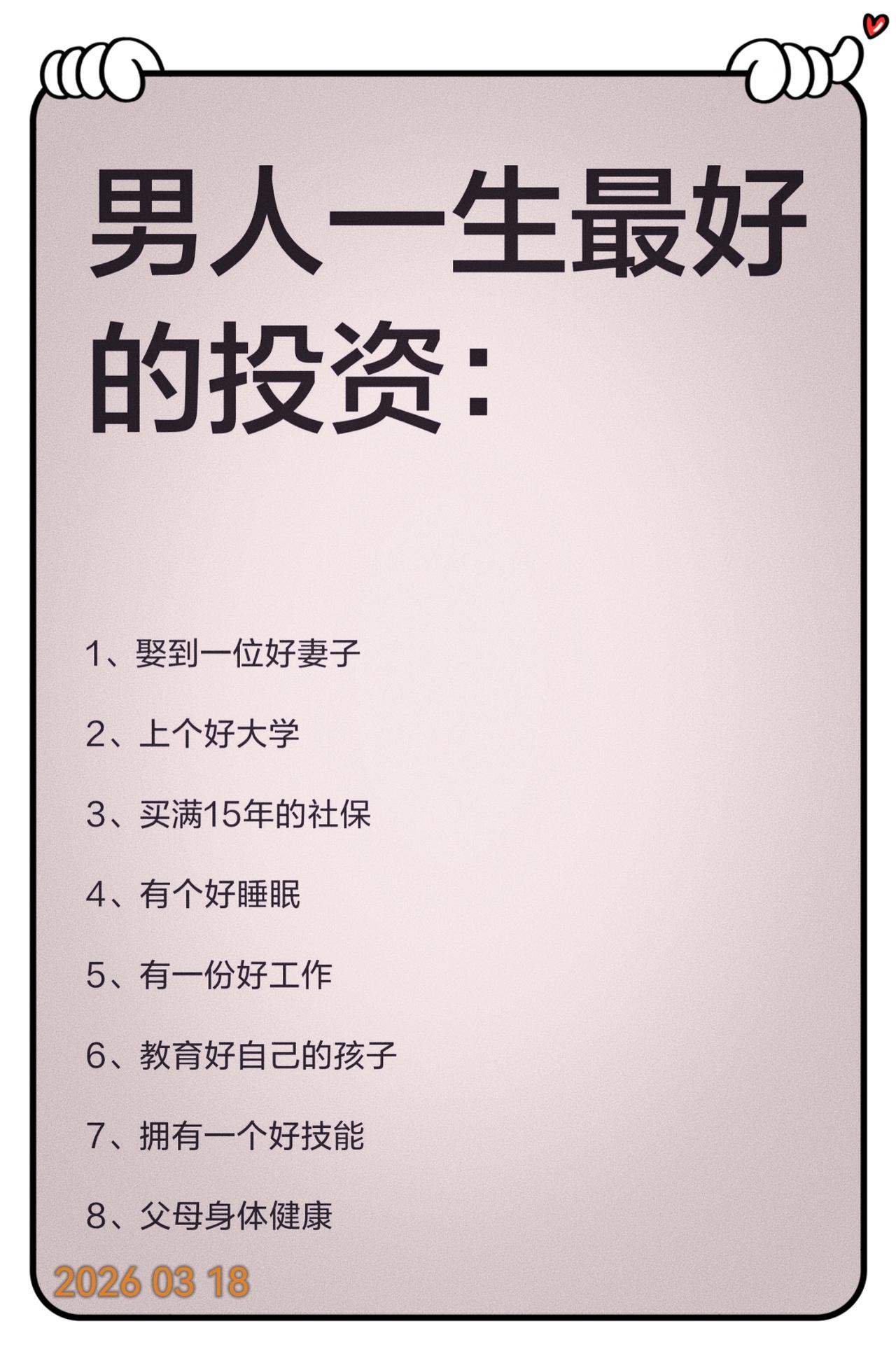 男人最高级的活法:把自己投资对 现在很多男人终其一生都在追逐名利、财富与地位,以为这就是成功的全部。可到了一定年纪才会明白,男人这一生最划算、最长久的投资,从来不是外在的物质,而是藏在生活里的这八件事。 娶到一位好妻子,是男人一生的福气。她是家庭的港湾,是情绪的归宿,更是风雨同行的伙伴,好妻子能撑起一个家的温度与底气。 上个好大学,是人生最公平的跳板。它带来的不只是学历,更是眼界、格局、圈层与选择的权利,让人生拥有更多可能。 买满15年社保,是给自己晚年最踏实的保障。年轻时的一份坚持,换来年老时的安稳体面,这是最朴素也最可靠的底气。 拥有一个好睡眠,是一切健康的根基。身体是革命的本钱,睡得好,精神足,才有精力去打拼、去守护家人。 有一份好工作,是立身于世的铠甲。它带来稳定的收入,也带来尊严与价值,让你在生活面前有底气,在家人面前有担当。 教育好自己的孩子,是生命最好的传承。孩子优秀,是家庭最大的财富,也是男人后半生最硬的底牌。 拥有一个好技能,是永不失业的铁饭碗。一技在手,走遍天下都不怕,无论时代如何变化,都能安身立命。 父母身体健康,是人生最大的福报。父母安康,家才有归处,心才有依靠,这是多少金钱都换不来的幸福。 男人这一生,拼的不是一时的风光,而是一世的安稳。把这八件事做好,便是最好的投资,也是最圆满的人生。