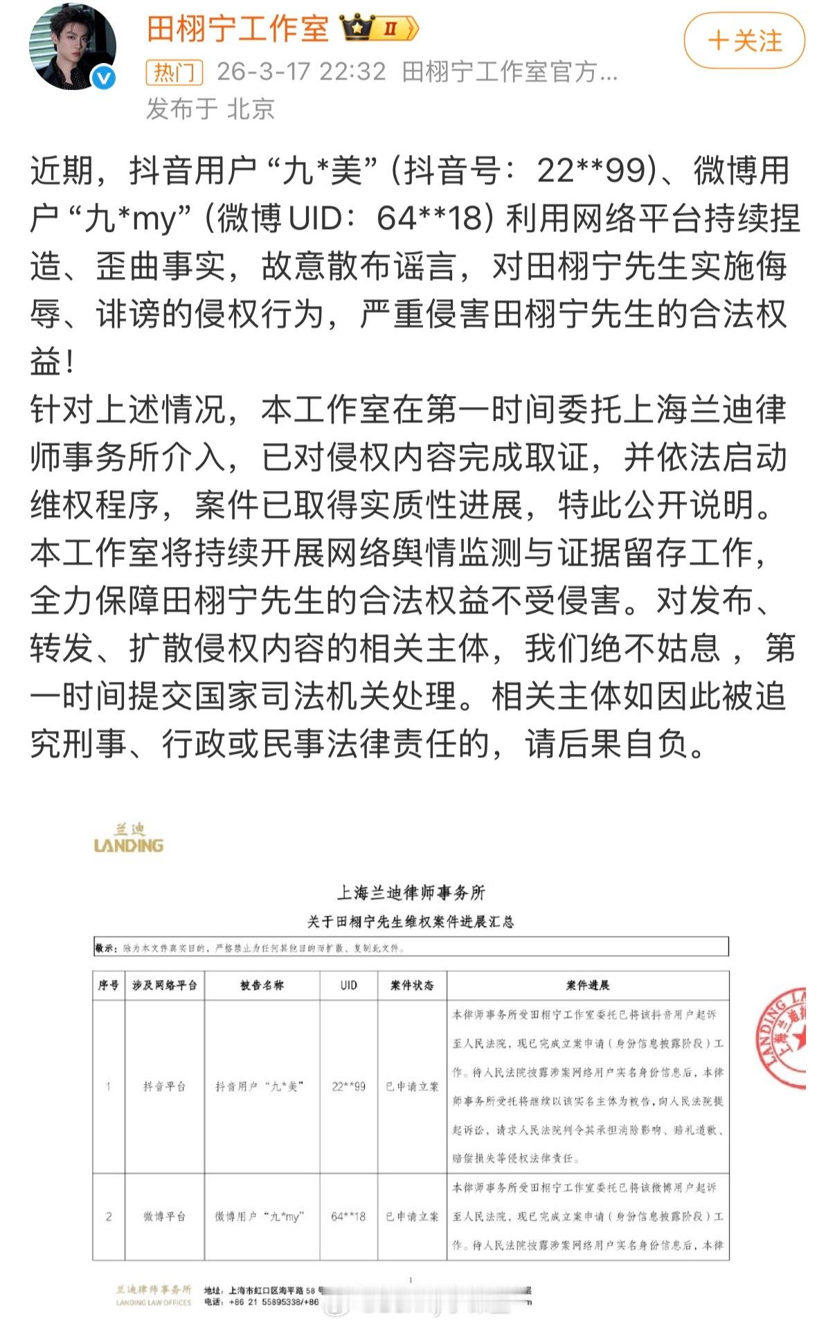 田栩宁工作室告了九成美并公布了案件进展!九成美对此回应:告就告吧,我会去的,我们都将为自己所做的事付出代价。这是