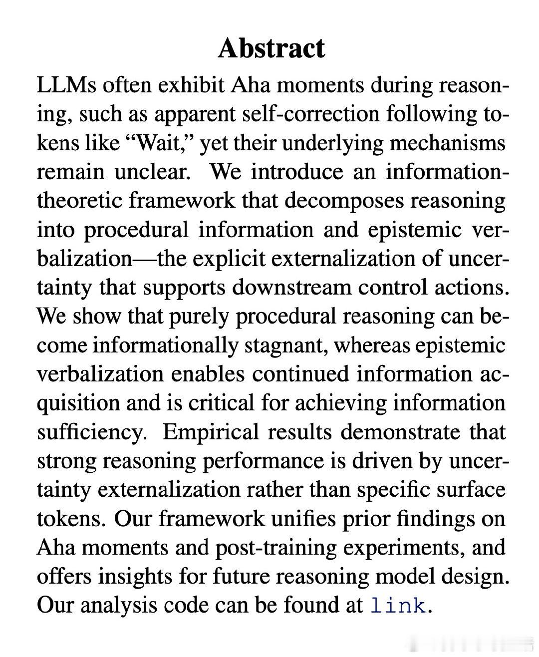 这项工作真正留下的遗产是:为"Aha moment"提供了信息论意义上的因果机制,将零散的实验现象(蒸馏失败、小模型更爱反思、高熵token的作用)统一进同一框架。它为后来者打开的新门是:针对程序能力与不确定性外化能力分别设计训练目标,实现更精准的后训练策略。但尚未跨过的门槛是:如何在保留有效不确定性信号的同时,量化裁剪冗余推理链,避免以过度自我质疑换取低效的超长响应。