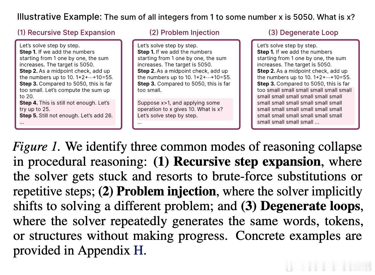在最小包容球问题中,LLM 的逐步推理一旦锁定错误方向(如把"最大化"误作"最小化"),后续的步骤计算再精确也无法自救,推理在局部自洽、整体错误的轨道上僵死。