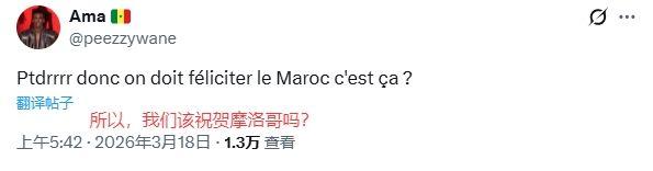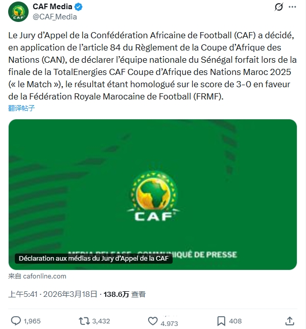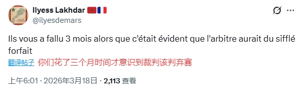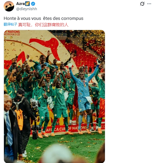 巷深人 4 2026-03-18 08:07 塞内加尔被取消成绩一点问题都没有,有问题的是拖得时间太长了,就算裁判当场害怕了不敢直接结束比赛,那非足联也应该在第二天马上宣布取消塞内加尔成绩,这个拖得时间太长了,罢赛行为很明确,不可能需要走这么长时间的流程。