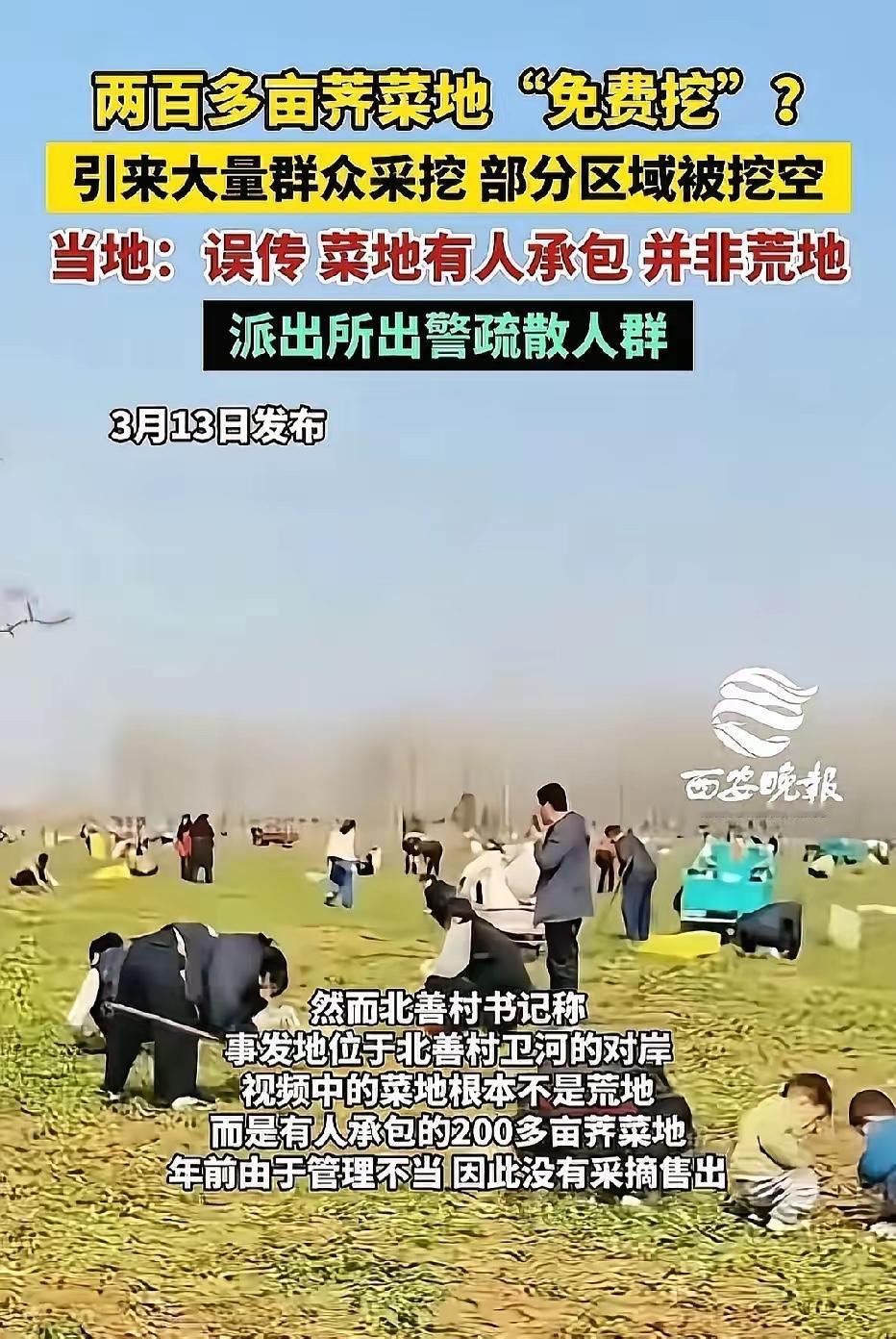 太嚣张!河南安阳,女子发现200亩荠菜,她不问主人,也不管地界,当场动手狂挖,还拍视频发到网上,甚至放话:免费的随便挖,还给出地址,消息一出,大批人蜂拥而至,整片荠菜被瞬间薅得精光。承包地主人赶到当场傻眼,拼命驱赶也拦不住,崩溃报警。女子结局大快人心! 事情刚发生时,谁也没想到会闹得这么大。 那段视频我刷到过,一个女的站在绿油油的荠菜地里,笑得挺开心,举着刚挖的荠菜冲镜头喊:“家人们快冲!卫河边几百亩荠菜没人要了,免费挖,随便薅!”还特意把定位标在河北魏县,可那块地实际上归河南内黄县马上乡管。就这一条几十秒的视频,像往油锅里倒了滴水,彻底炸开了锅。 头一天还只有零星几个人去试探,第二天就变成了几百人的大军。有人开着私家车拖家带口来的,有人骑着电动三轮车后头绑着编织袋来的。到了地里,那场面真没法看——西装革履的蹲在地上刨土,化着妆的姑娘跪在泥里头挖,老人孩子齐上阵,生怕慢一步就亏了。有人为了抢地盘差点打起来,有人直接把车开进田埂碾压。田埂上停满了车,堵得水泄不通。地里原本整齐的荠菜,被薅得东一块西一块,绿一片黄一片。 承包户李先生赶到的时候,整个人都傻了。这260亩荠菜是他承包种的经济作物,一家人就指望着这季收成。年前管理没跟上,错过了春节上市的好时机,本想着春天慢慢收,好歹能回本。结果倒好,一夜之间让人薅得精光。他拼命喊别挖了别挖了,这是私人承包的地!有人抬头瞅他一眼,继续低头挖;有人一边挖一边怼他:网上说免费的,你凭什么不让挖? 3月12号下午,实在拦不住了,李先生报了警。警车拉着警笛开进地里,民警用大喇叭一遍遍喊话:这片地是私人承包的,不是无主荒地,请大家立即停止采挖,马上离开!可喊话的时候,好些人连头都不抬一下,手上的动作反倒更快了。直到民警反复警告再挖就是违法,要承担法律责任,人群才不情不愿地慢慢散去。 等人走光了,地里已经没法看了。260亩荠菜,被挖走的挖走,踩烂的踩烂,剩下的也失去了商品价值。有人算了一笔账,260亩荠菜,亩产三四千斤,按一块钱一斤批发,毛估估就上百万元。种地不是天上掉馅饼,种子、化肥、人工、灌溉设施,哪样不是钱?李先生一年到头的辛苦,就这么打了水漂。 那个发视频的女子是谁?当地很快查清了。侯某某,网名“内黄仙姐”,是个有5万多粉丝的本地小网红。平时拍些本地生活和挖野菜的内容,这回估计是想蹭波流量。可她拍视频的时候,明明看见地里垄沟整齐、荠菜长得均匀,一眼就能看出是人工种的,却故意说成是无主荒地。甚至把河南内黄的地标成河北魏县,引得两省的人都往这儿赶。 3月13号,马上乡政府发了正式通报:这块地是承包地,因有人发布不实信息被误传为免费野菜地,公安机关正在对侯某某进行调查,将依法处理。通报一出,侯某某赶紧删视频、把账号设成私密。可网友早就截图了,她的正面照在网上传得到处都是。这下好了,流量是蹭到了,可蹭来的是啥?行政处罚跑不了,李先生的民事赔偿也得担着,按260亩损失来算,少说几十万。 那些挖菜的人呢?有人说自己也是被网红骗了。可这话站得住脚吗?那么大一片地,垄沟笔直、荠菜长得整整齐齐,跟路边的野地能一样吗?说白了,心里那点侥幸占了上风——反正大家都挖,多我一个不多;万一真有事,法不责众。可“法不责众”从来不是免责牌,明知是别人的东西还伸手,就是侵权。民警赶人的时候没追究他们,不代表这事就过去了。 这两年因为“免费”两个字闹出的事还少吗?哪儿哪儿有“免费挖菜”的视频,哪儿哪儿就有人蜂拥而上。平台审核有时候跟不上,造谣的成本又太低,受害的永远是那些老实巴交的农户。可再往深了想,一个网红的随口一说,就能煽动几百号人去抢,这背后的问题不光是造谣的人该罚,也是那些“免费就冲”的心态该醒醒了。 李先生的荠菜地,如今已经没法看了。他有没有拿到赔偿,侯某某最后会怎么判,这些还在等后续。可这件事给所有人都上了一课——看到“免费”俩字,先问一句:这真是无主的吗?别人的劳动成果,凭啥让你白拿? 各位读者你们怎么看?欢迎在评论区讨论。 信源参考:澎湃新闻《河南安阳“260亩荠菜被数百人哄抢”事件调查》、内黄县马上乡人民政府情况通报(2026年3月13日)