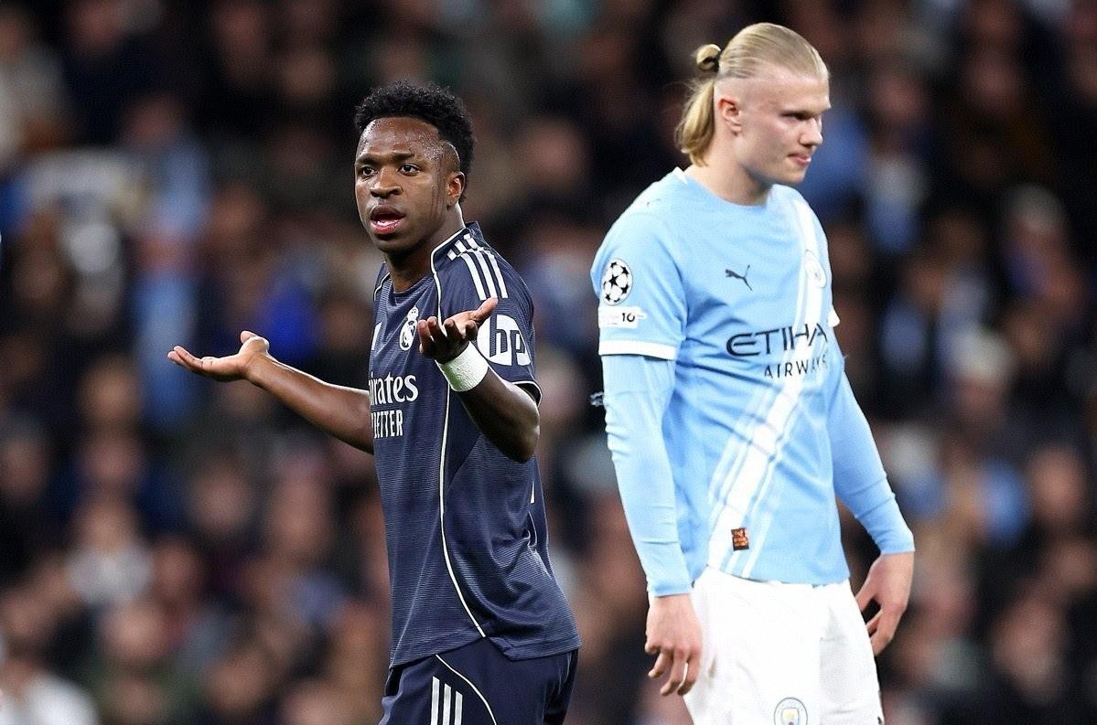 维尼休斯梅开二度,哈兰德破门,十人曼城主场1-2不敌皇马,被双杀淘汰出局,皇马晋