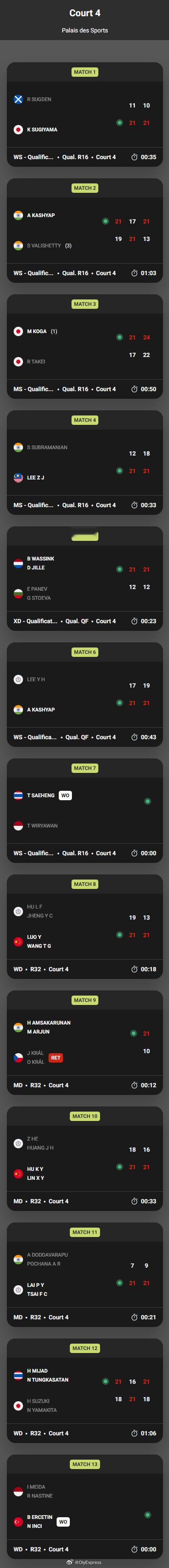 【奥尔良大师赛首日国羽九战全胜】2026年奥尔良羽毛球大师赛羽联超级赛 3月17日法国奥尔良,2026世界羽联超级300奥尔良大师赛揭幕,首日比赛国羽大获全胜6名(对)选手出战9次,全部奏凯。国羽赛果如下,完全赛果见图:男单资格赛首轮:朱轩辰21-16/21-15卡西克扬-普里亚(荷兰)胡哲安21-14/21-11霍尔姆(丹麦)董天尧21-16/21-4范德尔森(比利时)男单资格赛次轮:胡哲安21-12/21-18大林拓真(日本)朱轩辰21-18/21-14古贺穗(日本)董天尧21-18/21-14李梓嘉(马来西亚)男双:胡珂源/林祥毅21-18/21-16何志伟/黄睿璿(中国台北)女双:罗意/王汀戈21-19/21-13胡绫芳/郑宇倢(中国台北)鲍骊婧/罗徐敏21-4/21-10张净惠/杨景惇(中国台北)