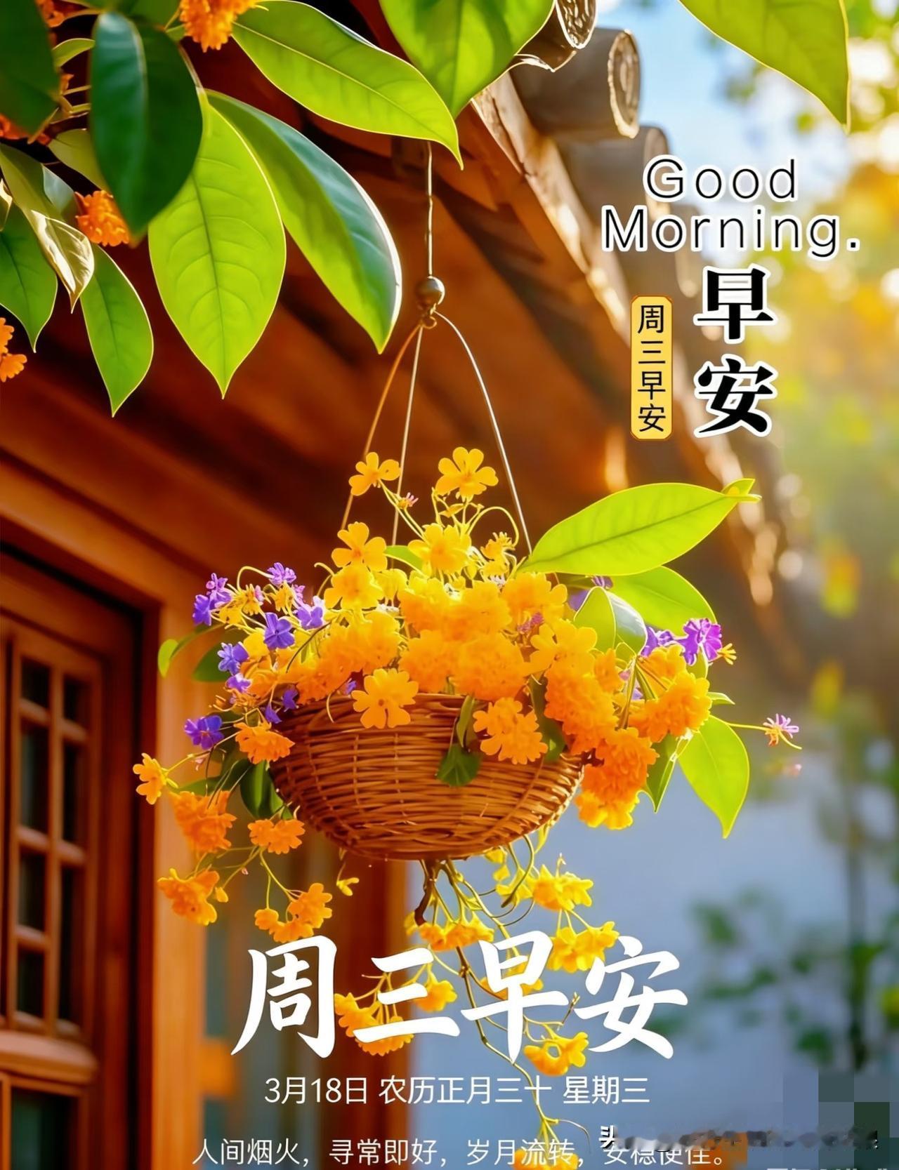 早安,周三到啦~ 不慌不忙,慢慢生活, 好好吃饭,好好休息, 愿你心里温暖,日子温柔[玫瑰] 周三早安! 愿你工作不累,烦恼消退, 笑容常在,万事顺心, 平安健康,就是最好的福气[万柿如意] 新的周三,新的开始, 愿你眼里有光,心中不慌, 生活简单快乐,事事有回应[福] 周三