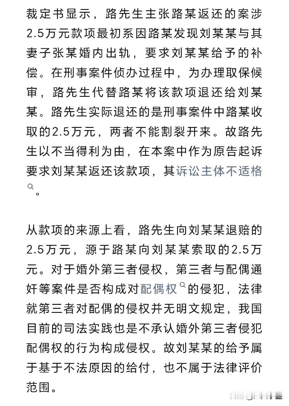 山东淄博,一位妻子把孩子送到辅导班学习后,与情夫在辅导班楼下的酒店开房,正在进行时,其丈夫突然闯了进来! 原来是,看到妻子临出门前精心画了妆,丈夫路某心生疑虑,觉得送孩子上辅导班至于这样浓妆淡抹吗?于是他悄悄跟在妻子后面,想要一探究竟! 结果便出现了开头那一幕,丈夫路某看到妻子跟陌生男人躺在床上非常气愤,对妻子说:孩子在楼上上辅导班,你却在楼下干这事!内心压抑不住怒火,顺手打了妻子情夫一拳,情夫刘某自知理亏并没有选择还手,同时提出要给路某补偿,两人经过协商约定,刘某给路某转账赔偿2.5万元! 事后,情夫刘某觉得这钱不能花,于是向当地公安部门报案,称路某对其进行了敲诈勒索。路某父亲担心儿子被判刑,于是把这2.5万还给了刘某,同时刘某出具了谅解书! 同年,淄博市张店区法院判定路某以非法占有为目的,以暴力威胁的方式,向他人索要财物数额较大,已构成敲诈勒索罪,最终判了路某6个月,并处罚金5000元! 事后,路某认为自己被妻子戴绿帽子,整个事件自己受伤害最大,妻子与情夫刘某一点事没有,他不服选择上诉,结果却被淄博中院驳回,维持原判! 事情转机发生在2023年,因为此事关注度较高,山东高院经过认真审查后让淄博中院对该案件进行再审。最终,经过审查,淄博中院判定刘某违背公序良俗,明知别人已婚却与其发生不正当关系,存在重大过错。是刘某为弥补过错主动提出给路某补偿的,路某不存在非法占有行为,判定路某无罪! 其实,淄博这件事发生在2021年,为什么最近又引起了关注?因为路某再审被改判无罪后,认为那2.5万是刘某自愿补偿给他的,既然自己没有罪,就不应该还给刘某,现在要以不当得利为由,起诉刘某把那2.5万连同利息合计2.8万一同返回! 3月13日,经过张店区法院经过审查,以诉讼主体不适格为由驳回了路某请求!目前路某经与代理律师商议后,计划本周上诉!上诉会有什么结果,拭目以待吧!
