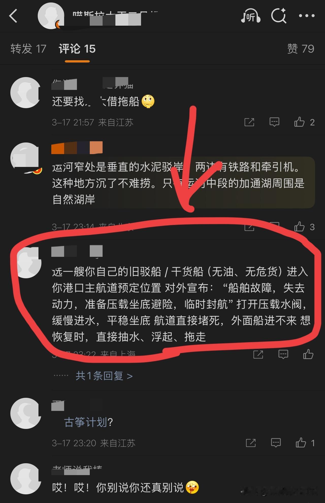 这哥们儿虽然是个人才,不过有点狠了,真这么干那这条运河估计要在相当长时间内变残废,解气是解气了,但会被相关方恨死,简直是堪称毒仕贾诩再世。不过这哥们儿只是从宏观理论上来讲的,具体操作方法还有诸多局限,但网友们从不缺内行,所以有网友对这个想法给出了实际操作办法。这位给出实操指南的网友应该是与海运相关的工作人员。由此看来贾诩虽然去世1800多年了,但他的传人似乎还在活跃。