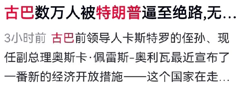 扛不住了!古巴67年立场大转向,被迫对美全面开放 特朗普极限施压下,古巴终于撑不住。近日古巴副总理宣布重磅开放:允许海外流亡者回国投资、持股、开外币账户、租赁农地,这是1959年革命以来最彻底的制度让步。 这不是主动改革,而是能源绞杀下的求生。委内瑞拉变局后古巴失去主要石油来源,美国加码封锁,连续3个月无油轮靠港。全国每日停电12小时,医院停手术、面包店烧木柴、企业缩工时,民生濒临停摆。 短短几天,古巴从强硬反美转向谈判、释囚、全面开放。曾经坚挺的反美堡垒,在现实面前低头。意识形态撑不起电力,反美口号换不来面包。 这不仅是古巴的转折,更是拉美左翼阵营松动的信号。小国在强权博弈中,形势比人强。 古巴用67年的坚持告诉世界:生存,永远是第一政治。 大国博弈,从来都是弱者买单。 对此,你有何认知度?