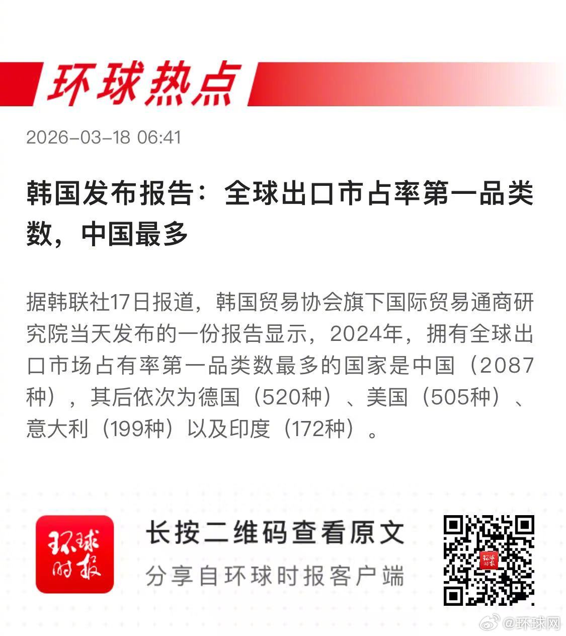 早安热点,新闻早点 ▲ #全球出口市占率第一品类数中国最多#▲#今年中国消费领域