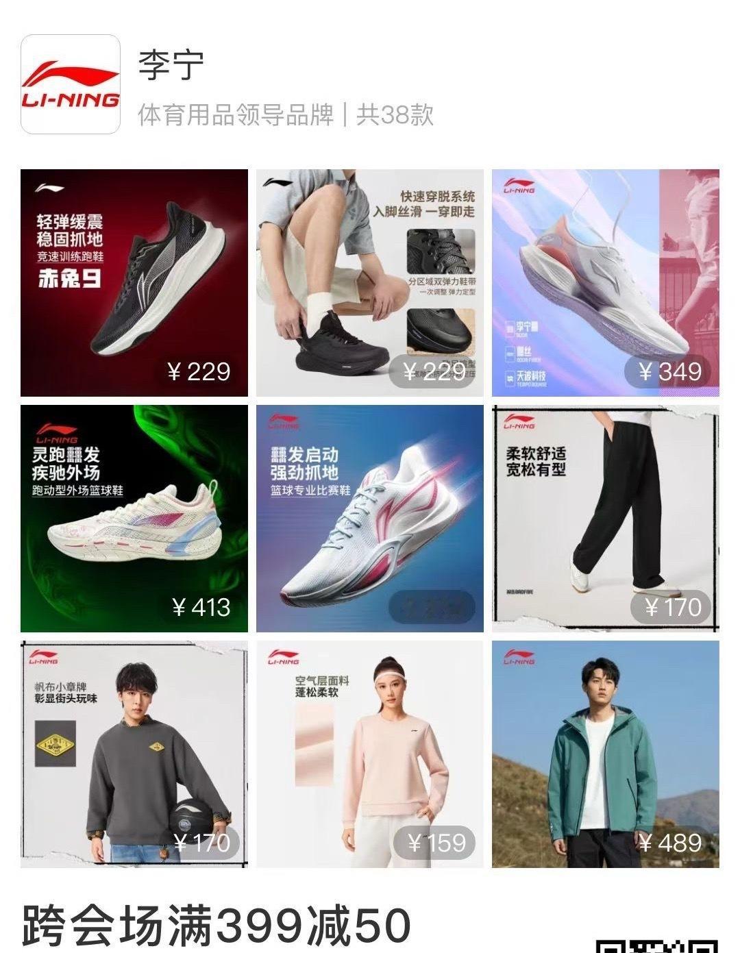 今天18号,李宁&安踏联合大促,满399减50可以混合,两个场一起凑。重点:这个