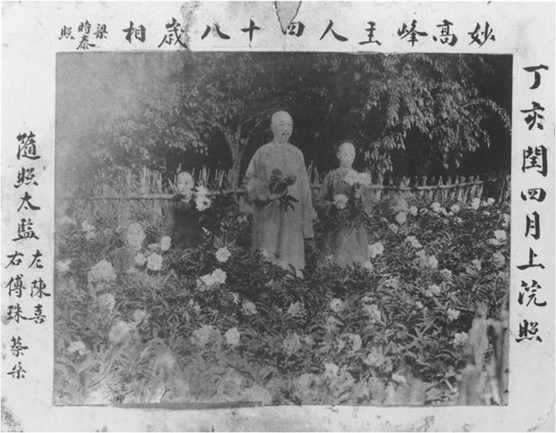 1887年,北京西山妙高峰,醇亲王奕譞48岁留影,左侧题字标注了随侍太监:左陈喜、右傅珠、蔡朵。。 这位光绪帝的生父、溥仪的祖父,在儿子登基后深恐慈禧猜忌,主动辞官隐居西山。照片里他素袍持花,与儿子、太监在芍药丛中赏花,刻意摆出一副“不问政事、寄情山水”的恬淡模样。 题字里的“妙高峰主人”“丁亥闰四月”“梁时泰照”,每一个字都藏着晚清宗室在权力漩涡里的生存智慧——用一张赏花照,向太后表尽“只想做个富贵闲人”的忠心。
