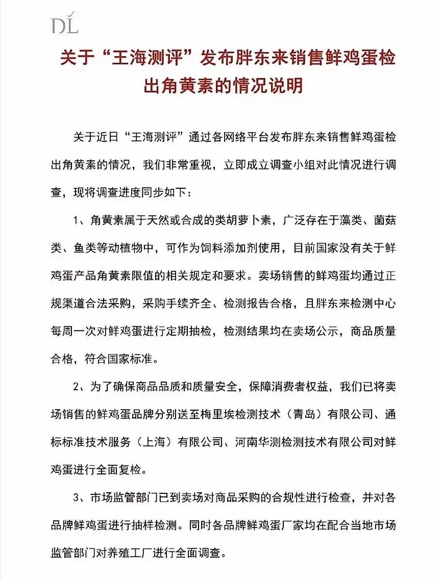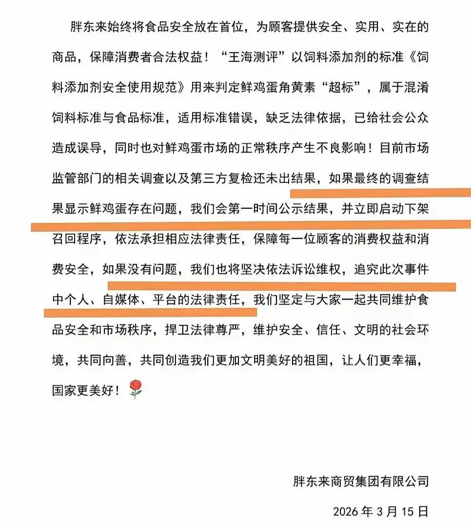 这种新闻自带好多流量与对立面。 一、“职业打假人”到底对还是错,到底是什么“货色”? 二、标准到底是什么? 三、企业面对打假到底该怎么做? 一一回答: 1、应该支持”职业打假人”吗? 网友发言:““职业打假”,就是社会的寄生虫!又立牌坊,又挣不义之财! 假货自有市监局处罚和当事人 索赔,职业干这事,甚至故意搞事,就是缺德、触碰道德底线甚至法律红线。” 网友还发言:“这种职业打假索赔人要追责才行,不然中国市场就乱了,谁还敢卖东西。发个牛头不对马尾的虚假检测的视频就能抹黑造谣敲诈勒索商家可还行,这个打假博主签名还写强调已经打了1700多个商家,国家不管管这号人吗?” 网友还发言:“王海打的假错不了,这个角黄素到底是哪里来的才是关键,如果没有这些职业打假人老百姓吃到的全是假货。” ——第三方打假必然是有利可图,我们遵循:“论迹不论心”得原则。谁也不是圣人,更何况职业打假人。 只要他不违反法律,比如造假检测证书,剪辑发视频这些,就不需要过分指责。因为第三方的监督是官方监督的有力补充,是维护广大群众的利益,不论他的出发点在哪。 没有这次的“打假”,大家哪里会关注鸡蛋这个每人每天都吃的健康问题呢? 2、标准到底是什么? 2026年3月13日,博主“王海测评”发视频称,胖东来超市的鸡蛋检测出一种名为角黄素(斑蝥黄)的人工色素,含量为9.54mg/kg,超出农业农村部发布的《饲料添加剂安全使用规范》蛋禽类饲料中斑蝥黄允许的最大添加量8mg/kg,存在一定的食用安全隐患。 针对“角黄素检出”一事,胖东来指出,我国现行《食品安全标准 蛋与蛋制品》及《食品添加剂使用标准》均未对鲜鸡蛋中角黄素残留设定限值,因此不存在“超标”问题;其次,明确指出博主将饲料添加剂标准套用于食品成品的逻辑错误,强调饲料标准与食品标准适用场景不同,不能混淆。 假定(看好了是假定),王海的检测结果没问题,那么鸡蛋里的人工(看好了,是人工)色素含量超过饲料里规定的的含量了。你说现行《食品安全标准 蛋与蛋制品》及《食品添加剂使用标准》没有规定,这明显是有问题的。因为《食品安全标准 蛋与蛋制品》及《食品添加剂使用标准》这两个标准不可能罗列所有不准添加的东西。因此,不罗列的,理论上(注意是理论上)不应该出现。 3、企业该怎么做? 之前,老罗指出西贝预制菜,西北贾应该是上了公关课的经典反面教材案例。 而这次,胖东来应对就很得体。身为企业,不应该惧怕问题,积极面对问题,提出自己的疑问。比如标准是什么?比如检测结果是否作假等等? 最后声明如果真,我赔偿;如果假,你赔偿。 这就很合理嘛。 即明确了我的责任,也明确了你的责任。 逼的“王海测评”也更新视频,态度诚恳地表示,若原视频个别表述在传播中引发理解歧义,将向公众诚挚道歉,并对可能造成误读的内容进行必要说明 。 最后想表明的是: 工业化对整个人类的进化已经起到了巨大的干预作用。就连鸡蛋都出现了人工合成的色素,无论是哪个环节造成的。 身为食物链顶端的我们庆幸健康活着的每一天吧!