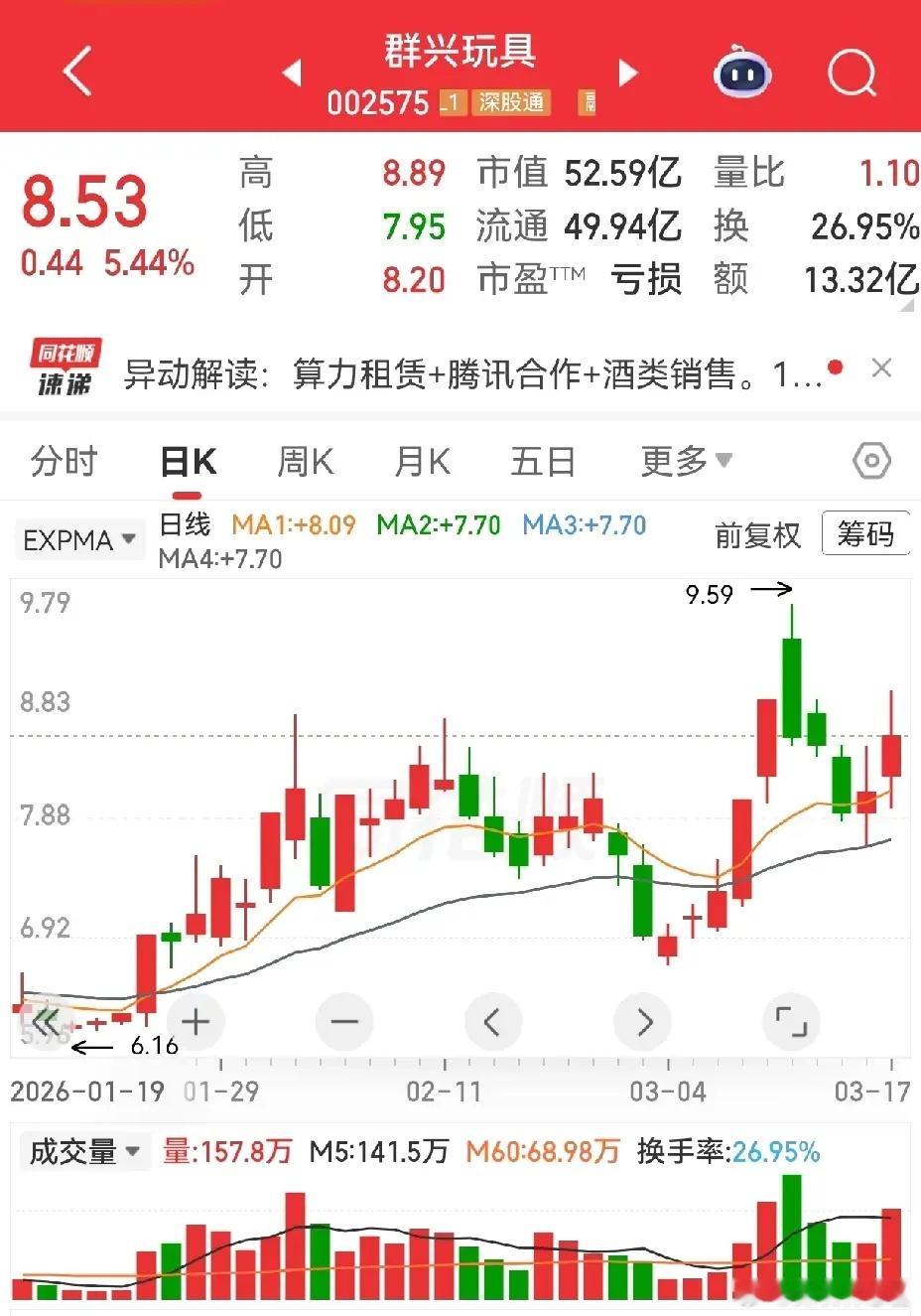 群兴玩具两连板后收出三连阴,同样在生命线位置止跌企稳,连续两日阳线放量,资金承接力度有所增强。