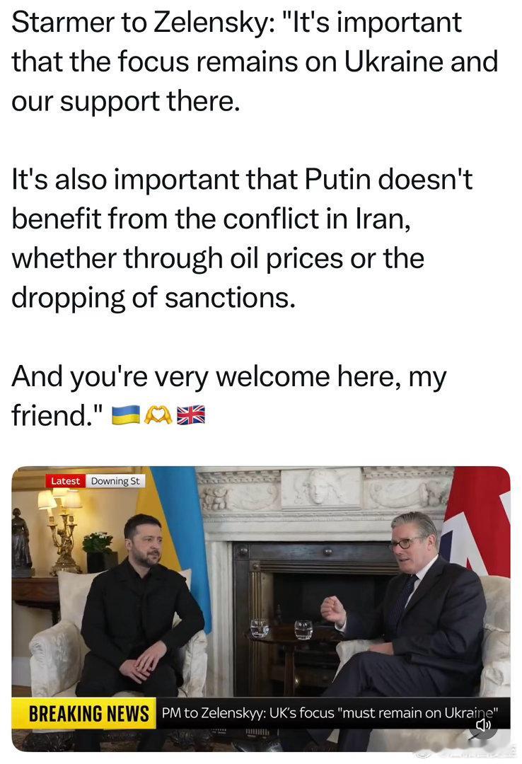 Starmer称:当下,依然要关注乌克兰局势、重点支持乌克兰;伊朗战争,不能让俄趁机获利,不应解除对俄制裁