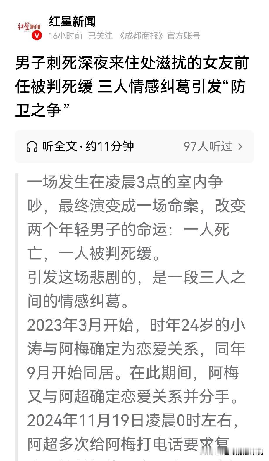 真正的红颜祸水!甘肃金昌,阿梅网上认识了小涛,两人同居,又因吵架分手。随后阿梅又与阿超恋爱同居,分手后她又回到小涛那里。阿超趁着酒劲,开车找到阿梅和她争吵,小涛加入,两人先动嘴、后动手,小涛用折叠刀将阿超捅刺身亡。一审、二审,小涛因故意杀人罪,被判处死刑缓期两年,家属不服,提交了刑事再审申请书。网友:真正的红颜祸水! 20岁的阿梅在网上认识了24岁小涛,两人确定恋爱关系,很快租房同居。 那天阿梅要出去和闺蜜逛街,小涛不让,两人大吵一架,小涛提了分手。 但两人仍藕断丝连,阿梅还经常来出租屋。 后来,阿梅在外面喝酒时认识了阿超,两人很快谈起了恋爱。 可阿梅脚踏两只船,忘不了那个,还舍不了这个。 她和阿超的关系也没持续多久,两人分手。 果然,阿梅前脚阿超分手后,后脚又回到了小涛身边。 谁也没想到, 就因为阿梅,两个男人两败俱伤,还毁了两个家庭。 2024年11月18日晚上,小涛和阿梅又因为一点小事吵了起来。 小涛心情不好,出门散心去了,后被阿梅叫回来,就去卧室睡觉了。 当晚,阿超多次给阿梅打电话,要求和好,被阿梅拒绝。 阿超不甘心,趁着酒劲开车找到阿梅住处。 他把阿梅叫出来,两人在门口吵起来。 小涛在卧室睡觉,半夜听到有人吵架出来查看。 阿超说他是阿梅的前男友,小涛气的让他离开。 可阿超喝了酒,根本不听劝,两人你一句他一句吵了起来。 争吵中,两人相互撕扯,小涛一眼看见茶几上的折叠刀。 他顺手拿起刀,在阿超面前比划着。 阿超也不甘示弱,撕住了小涛的衣领把他推进屋内,两人推搡撕扯。 过程中,小涛用折叠刀对着阿超身上就是一顿捅刺、划刺,阿超倒在了地上。 阿梅看到这一幕,吓得赶紧抢走了小涛手中的折叠刀,扔到了厨房水池里。 可小涛已经杀红了眼,又去厨房拿起了一把水果刀。 阿梅再次把水果刀抢了下来,扔回了厨房水池。 阿梅知道自己制止不了,赶紧给小涛父亲打了电话。 小涛父亲到场后,让阿梅打120和110。 可医生赶到现场后,阿超已经没有了生命体征。 警方也随后赶到,将小涛抓获。 这起案件的核心,小涛的行为,到底算不算正当防卫,或者防卫过当? 毕竟,阿超是酒后驾车主动找上门的,还和阿梅争执,这确实对小涛和阿梅的生活造成了滋扰。 法院的判决书里,也记录了两个细节: 一、阿超在案发前一天晚上曾和朋友一起喝酒。 酒后驾车来到小涛和阿梅的住处,下车后车辆还一直处于启动状态。 二、相关检验报告显示,阿超属于醉驾。 这些似乎都在证明,阿超确实存在过错。 最终法院认为,阿超虽然酒后深夜到小涛住宅滋扰,有一定过错。 但并未对他人人身和财产造成严重威胁,属于轻微的不法侵害。 而小涛在清醒的情况下,拿刀致阿超死亡,不应认定为防卫行为。 法院认为,小涛持刀连续捅刺阿超胸腹部,等要害部位。 有非法剥夺他人生命的主观故意,构成故意杀人罪。 一审判决,以小涛犯故意杀人罪,判处死刑缓期两年执行,并赔偿阿超亲属经济损失6万余元。 一审后,双方都不服,提出了上诉。 高院组成合议,小涛和辩护人再次强调,阿超的过错,以及小涛的行为应属于防卫。 法院未采纳。 最终,高院作出终审裁定,驳回各方上诉,维持原判。 这个结果,两个家庭都难以接受。 阿超的诉讼代理人觉得,判决结果合适,阿超虽然有过错,但罪不至死。 小涛一方,则始终坚持认为,他属于正当防卫,或者防卫过当,不构成故意杀人罪。 小涛再次提交了刑事再审申请书。 《刑法》第二百三十二条:故意杀人的,处死刑、无期徒刑或者十年以上有期徒刑;情节较轻的,处三年以上十年以下有期徒刑。 法院以故意杀人罪对小涛定罪量刑是有道理的。 阿超虽酒后驾车主动上门滋扰,存在一定过错,但他只是与小涛发生争吵和推搡,这属于轻微的不法侵害。 而小涛在清醒状态下,造成了阿超死亡的后果,符合故意杀人罪的构成要件。 也就是说,虽然阿超的行为令人反感,但其过错程度,没达到失去生命的后果。 就这样,一个女孩,害了两个男人、两个家庭,而她却毫发无损,全身而退。 提醒年轻人再找伴侣时,擦亮眼睛,一定要慎之又慎,宁缺毋滥。 对于这样的事,您有那些看法呢? 关注@赵哥的法律观,评论区发表你的看法。
