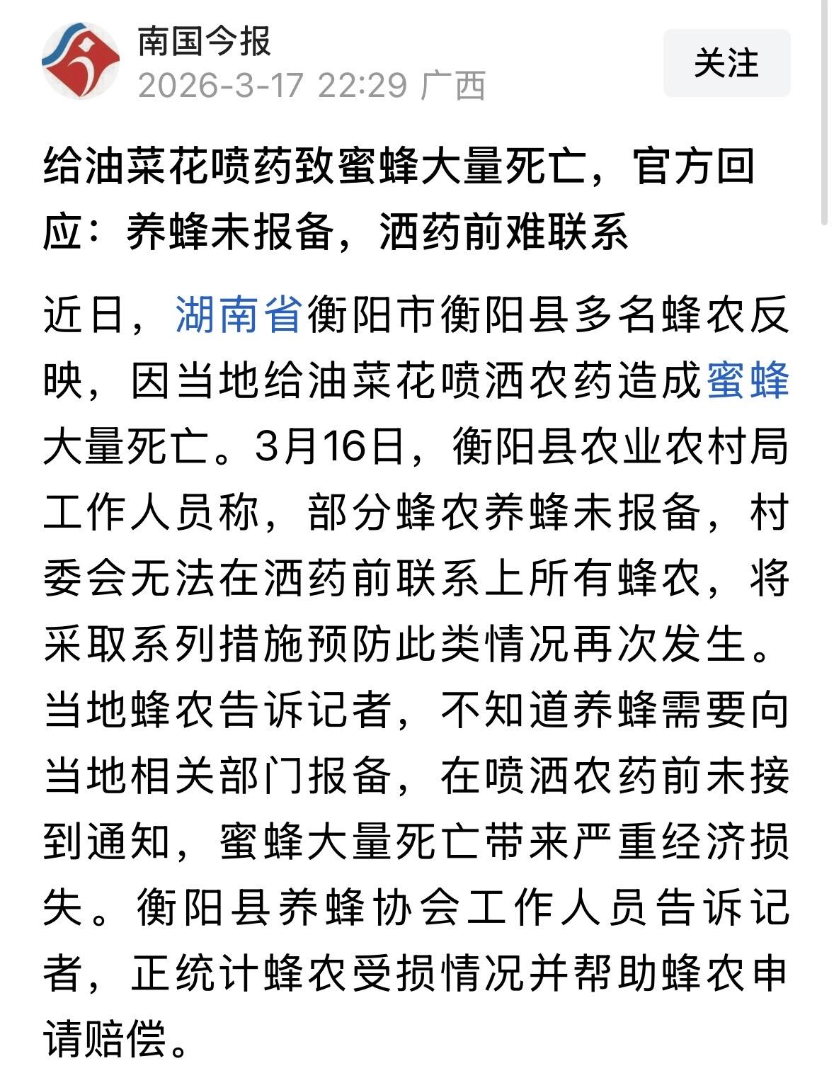 湖南衡阳,一村里的蜂农们发现油菜花地不知何时被喷了农药,他们养的蜜蜂大量死亡,损失惨重,一问工作人员,对方说好多蜂农都没报备,所以没法在洒药前一一通知到位,然而,蜂农却表示不知道养蜂还要报备这件事。 油菜花开得正艳,本该是蜂农老刘(化名)一年里最盼着的黄金季,可这会儿,他蹲在田埂上,手里攥着把死蜜蜂,脸色要多难看有多难看。 完了,全完了!老刘心里顿时乱糟糟。 就在头天晚上,他还想着这茬花能取多少蜜,谁知一夜之间,几箱蜂死得硬邦邦,连个挣扎的痕迹都没有。 不止他一家,附近好几个养蜂户都遭了殃,蜂箱前一摊摊的死蜂,看得人头皮发麻。 老刘越想越窝火,他压根就没接到过啥打药的通知。要是知道要喷农药,哪怕连夜搬箱子也得挪窝啊! 他跑去问村支书,得到的答复更让他心里堵得慌。 对方表示:上面说了,有些养蜂的没报备,村里想通知也找不着人。 老刘一听,怒火烧的更旺了。报备?养个蜂还要报备?他跟几个受灾的蜂农凑一块唠嗑,大家都是一脸懵。 祖祖辈辈追着花跑,哪听说过还得去哪个部门盖个章才准放蜂?大家伙儿只知道找花多的地方,哪懂这里头还有规矩。 这事闹大了,部门的人也下来了。 面对蜂农的质问,工作人员也挺无奈,解释说现在的农药都是无人机飞喷,范围大、速度快,要是不知道蜂箱具体在哪,真没法精准避开。不是不想管,是真联系不上。 这话听着在理,可落在老刘这些损失惨重的人耳里,就像是句推脱。 一句联系不上,我几万块钱就打水漂了?老刘看着空荡荡的蜂箱,心里那个急。 蜂蜜绝收是小事,蜂种死了,来年的本钱都没了。 好在天无绝人之路,县养蜂协会的人这时候站了出来。 协会的老陈(化名)这几天脚不沾地,挨家挨户跑,拿着本子记:老王家死了三箱,老李家绝收五箱…… 他一边记一边安抚大家:别急,损失数我们都在核实,正在帮大家跑赔偿的事。 听到这话,老刘心里稍微踏实了点,但还是犯难。这赔偿到底能不能下来?啥时候下来?村里说是因为没报备才没通知,可这“报备”的规矩到底是哪条法律写的? 他不懂法,只认死理:我在这放蜂,你打药把我蜂毒死了,这就得赔。 如今虽然开始统计损失,但要把这本糊涂账算清楚,让受损的蜂农真正拿到钱,恐怕还得费不少周折。 有人说,首先油菜花期不用打药,这个是常识。不光是人养的蜜蜂,还有一些野蜜蜂及一些授粉的昆虫,你一打药全给打死了,会造成生态灾难的。 油菜花期打农药是谁提出来的,又是谁执行的,要严律问责,该判的判,该罚的罚! 《农药管理条例》第27条规定:使用农药应当遵守国家有关规定,在特定区域、时段或者针对特定作物使用农药的,应当采取安全防护措施,防止对周边敏感生物造成损害…… 虽然有蜂农未报备影响通知效率,但根据条例,施药方在人口密集或养殖区作业有法定防护责任。 当地因部分蜂农未报备就未采取避让或通知措施,导致蜜蜂中毒死亡,明显违规。 施药方存在重大过失,需承担主要侵权赔偿责任。 “未报备”不能成为免责理由,只能作为减轻责任的考量因素,蜂农有权索赔。 对此,你怎么看? 关注@运良说法 学法律知识不迷路