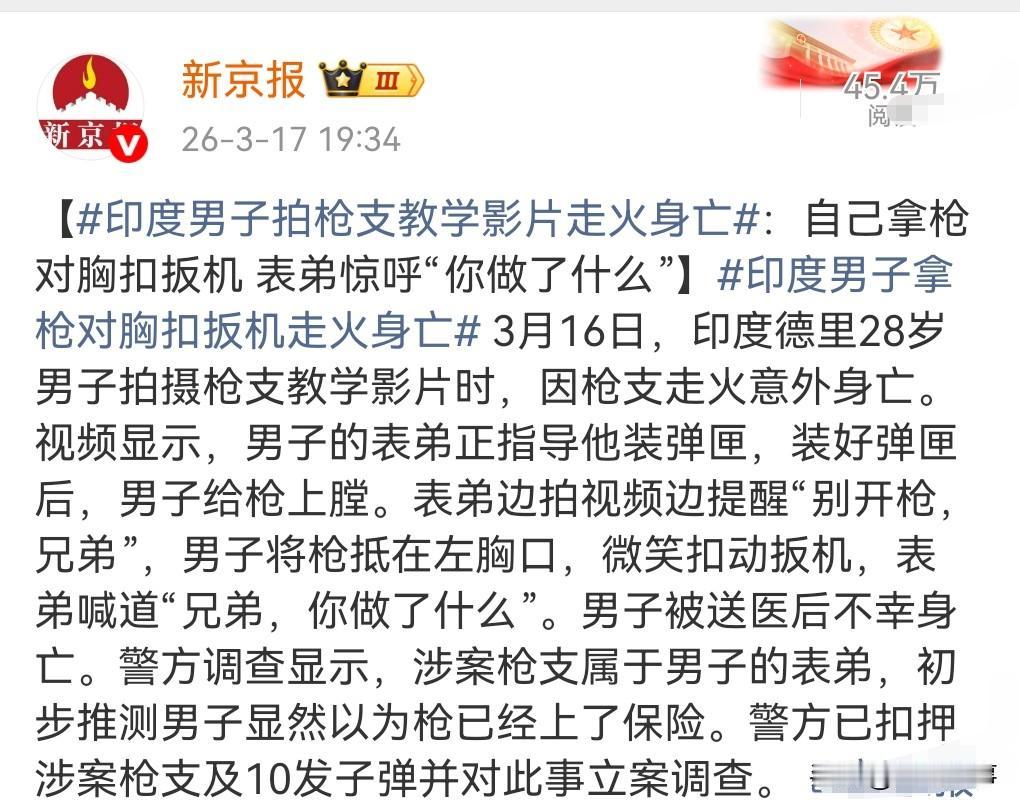 好好的玩什么枪呀,结果把自己的性命给搭上了。 3月16日印度,印度男子拍枪支教