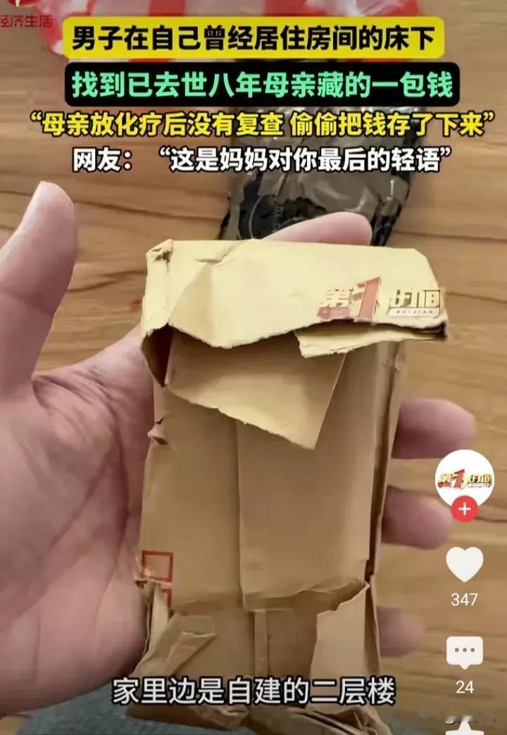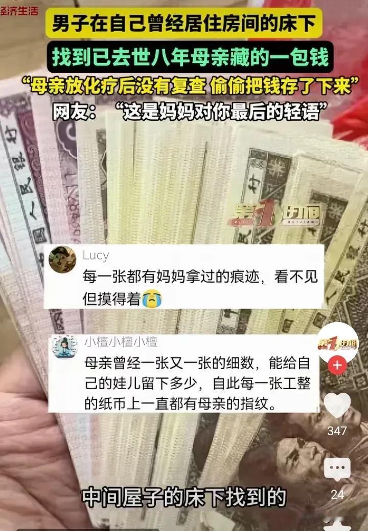 河南男子在床底发现母亲8年前藏的钱,瞬间泪崩:妈妈最后的爱,藏得太深了 河南,一个男人,在自己曾经住过的房间床底下,翻出了一包钱。 钱用塑料袋裹着,一层又一层,裹得严严实实。 打开一看,是一叠叠整齐的纸币,有些还是老版的人民币。 他数了数,不多,但也不少。 更让他心碎的是,这些钱,是母亲8年前藏的。 那时候,母亲查出癌症,做了放化疗。 她知道自己的时间不多了,也知道家里不宽裕。 她做了一个决定:不再复查,把钱省下来,留给孩子。 她把钱一张一张攒起来,包好,藏进儿子曾经住过的房间床底下。 她没告诉任何人。 她只是默默地想:这间房是儿子住过的,他以后回来,可能会翻到。 就算她走了,儿子也能收到她最后的心意。 8年后,儿子真的翻到了。 他捧着那包钱,蹲在地上,哭了很久。 这件事在网上传开后,评论区全是泪目。 有人说:“妈妈不是不想活了,是更想让你们好好活。” 有人说:“她知道自己治不好了,把钱省下来,是给孩子留条后路。” 还有人说:“这是妈妈最后的‘轻语’,跨越生死,等了8年,终于被听见。” 是啊。 母亲得了癌症,按理说,应该继续治疗,继续花钱。 可她算了算账,觉得治下去,可能人财两空。 她选择停下,选择把钱省下来,留给那个她最放不下的人。 她藏钱的地方,是儿子住过的房间。 她相信,儿子一定会回来,一定会翻到,一定会明白她的心意。 这份信任,比钱更重。 那包钱,不是一摞整整齐齐的新钞。 有老的,有新的,有皱巴巴的,有叠得方方正正的。 每一张,都可能是她从买菜的钱里省下来的。 每一张,都可能是她卖废品攒起来的。 每一张,都可能是她舍不得吃、舍不得穿,硬抠出来的。 8年了,钱上还留着她的指纹。 儿子捧在手里,就像握着母亲的手。 他可能会想:妈妈藏这些钱的时候,在想什么? 是想着儿子以后能少还点贷款? 是想着孙子孙女能多买几件新衣服? 还是想着,自己走了,还能给这个家留点念想? 没人知道。 但所有人都知道,这份爱,跨越了生死。 我们常常歌颂母爱伟大,但真正的母爱,从来不是轰轰烈烈的宣言,它藏在细节里。 可能是你回家时,桌上永远热着的饭菜。 可能是你出门时,她悄悄塞进你包里的零钱。 可能是你打电话时,她总说“没事,忙你的,不用老惦记我”。 也可能是,这床底下,藏了8年的一包钱。 她不会说“我爱你”,但她做的每一件事,都在说“我爱你”。 她不会告诉你她有多难,但她用沉默,扛下了所有的难。 这份爱,细碎、低调、甚至有点笨拙。 但它是最真的。 那个儿子,捧着8年前的积蓄,一定在想: 如果妈妈还在,该多好。 可惜,时间不会倒流。 我们能做的,就是在还来得及的时候,多看看身边的父母。 别等他们走了,才想起他们藏了多少爱。 别等他们不在了,才后悔没有多陪陪他们。 那个藏在床底下的秘密,是妈妈最后的牵挂。 而我们每个人,都该趁父母还在,多听听他们的唠叨,多看看他们的背影,多摸摸他们的手。 别让那些藏在时光里的爱,等到失去后才被发现。 愿每一个母亲的爱,都能被温柔以待。