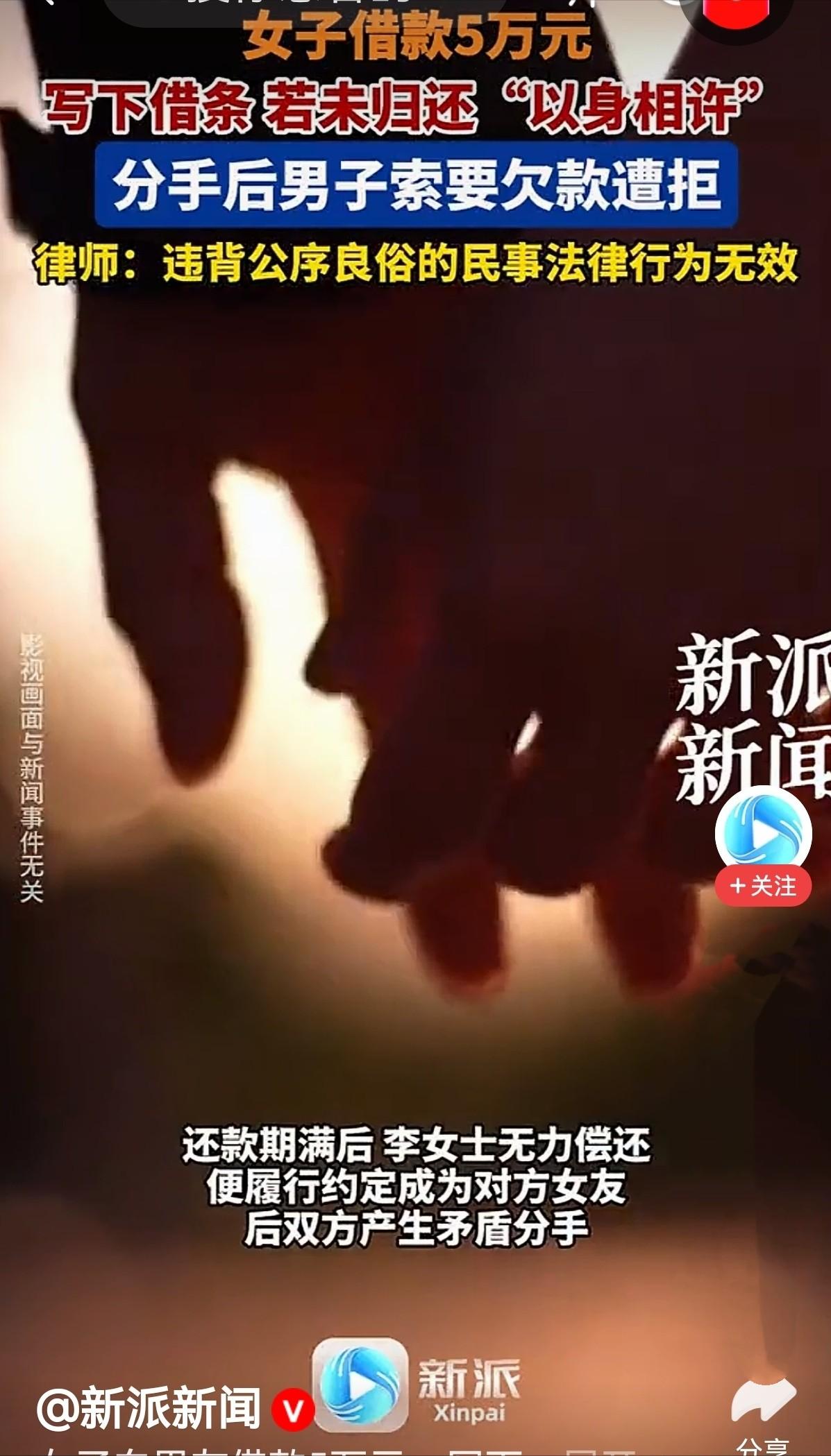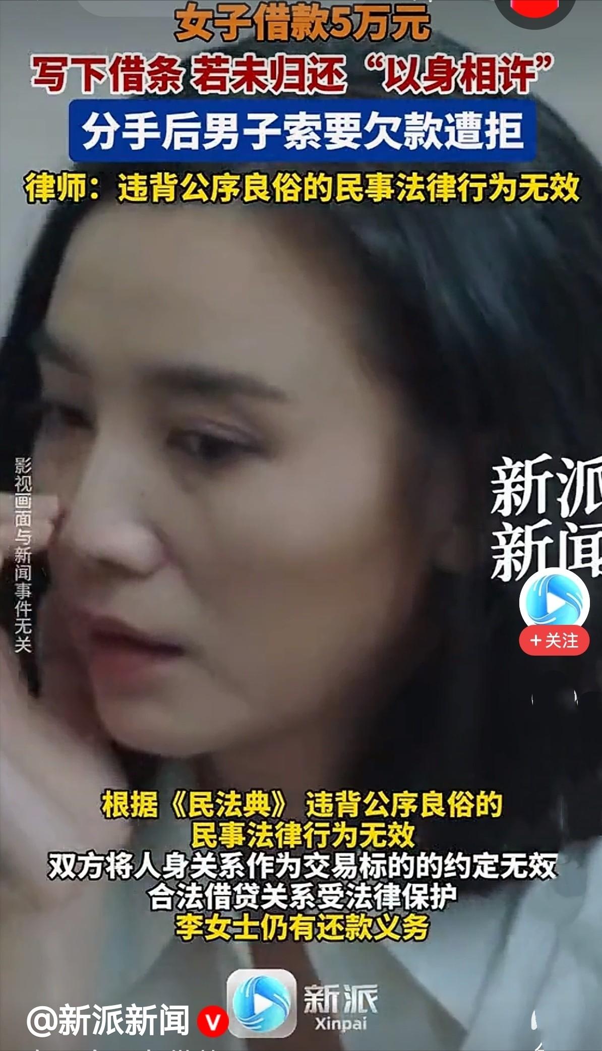 白嫖成功了!女子向男子借了5万元,男子问她要是还不上咋办?女子没犹豫:还不上就以身相许!男子同意。女子约定了还款日期并写了借条。谁知,还款期满,女子真没钱还,只能去做男子女朋友。后两人发生矛盾分手,男子转头就要那5万元欠款。女子怒了:我已履约,钱不还了!你出尔反尔?网友:这男人不讲武德! 李女士平时一直在做小本生意,开了一家小小的服装店,平时起早贪黑进货、看店,挣的钱刚够维持店里的房租、水电和自己的日常开销,算不上大富大贵,但也能安稳度日。 可前段时间,她遇到了资金周转的难题,供货商催着结货款,房租也到了缴纳日期,加上平时的生活开销,几笔钱凑在一起,压得她喘不过气。 李女士一开始试着找身边的亲友借钱周转,可要么是大家手头都不宽裕,要么是怕她还不上不敢借,来来回回碰了好几次壁,急得她整夜睡不着觉。 思来想去,她想到了平时关系还不错的朋友张先生,两人认识有三四年了,平时偶尔会一起吃饭、聊聊天,算不上亲密无间,但也算知根知底。 张先生也知道李女士一直在打理自己的小服装店,之前也听过她吐槽生意难做、资金紧张,只是没想到,她会主动开口向自己借钱,而且一借就是5万元。 这笔5万元的欠款,对张先生来说也不是小数目,他是一名普通的上班族,每个月工资不算高,这笔钱是他省吃俭用攒了大半年的积蓄,本来是打算用来攒着买房付首付的。 收到李女士的借钱请求后,他犹豫了很久,一边是朋友情面,毕竟认识这么久,看着对方急得团团转,实在不忍心直接拒绝。 另一边又担心钱借出去打了水漂,毕竟李女士当时的生意处境并不好,能不能按时还钱,谁心里都没底,万一她一直还不上,自己的买房计划也会被打乱。 张先生纠结了好几天,期间还私下打听了一下李女士的生意状况,得知她只是暂时周转不开,平时为人也还算讲信用,最终还是心软了,决定把钱借给她。 转钱的那天,两人约在一家咖啡馆见面,张先生把钱转给李女士后,还是忍不住多问了一句:“我知道你现在难处,这笔钱我可以借你,但你得说实话,什么时候能还?要是到了还款日期,你真的还不上,咋办?” 李女士当时正急着用钱,听到这话没有丝毫犹豫,看着张先生认真地说:“你放心,我肯定会按时还的,要是真的还不上,我就以身相许,做你女朋友,绝不会让你吃亏。” 这话听着像是一句玩笑,可当时两人都没有当儿戏,李女士当场拿出纸笔,手写了一张借条,明确写了借款金额5万元、还款日期,还签上了自己的名字,张先生也在借条上签了字,两人算是正式敲定了借钱的事,也默认了那个“以身相许”的约定。 拿到钱后,李女士赶紧结清了货款和房租,总算缓解了燃眉之急,她也一直努力打理生意,想着尽快攒钱还款,不辜负张先生的信任。 可生意的困境不是一时半会儿能解开的,加上后续又遇到了淡季,客流量减少,营业额大幅下滑,她东拼西凑,到了还款日期,还是没能凑够5万元。 还款期满那天,李女士主动找到了张先生,红着脸如实说明了自己的情况,问他能不能宽限一段时间,等自己生意好转了就立马还钱。 可张先生当时也有自己的计划,他急需这笔钱凑首付,没有同意宽限,两人僵持了半天,最后李女士想起当初的约定,主动提出兑现承诺,做张先生的女朋友,以此抵消这笔欠款,张先生犹豫了一下,最终同意了。 两人就这样确立了恋爱关系,一开始相处得还算融洽,张先生偶尔会去李女士的店里帮忙,李女士也会抽出时间陪张先生吃饭、逛街。 可相处的时间久了,矛盾渐渐冒了出来,李女士心思都在生意上,经常没时间陪张先生,两人常常因为琐事拌嘴。 加上张先生总觉得李女士是因为欠款才和自己在一起,心里一直有隔阂,对李女士也算不上真心,没过三个月,两人就因为一次激烈的争吵,彻底闹掰分手了。 分手还没几天,张先生就主动联系李女士,开口就索要那5万元欠款,说当初的“以身相许”只是一句玩笑话,不能当真,借贷关系是真实存在的,她必须按时还款。 李女士当场就怒了,觉得自己受到了欺骗,反驳道:“当初是你问我还不上咋办,我才说以身相许,我已经履约做了你三个月女朋友,你现在分手就翻脸要债,就是出尔反尔,这钱我不还了!” 两人各执一词,吵得不可开交,谁也不肯让步,最后张先生没办法,只能起诉到法院,希望通过法律途径要回自己的5万元欠款。 最终,法院经过审理后明确,李女士和张先生之间的借贷关系合法有效,受到法律保护,而“以身相许”的约定,违背了婚姻自由的法律原则,属于无效约定,不能作为免除李女士还款义务的理由,判决李女士限期偿还张先生5万元欠款。 这场因借钱引发的闹剧,也给大家提了个醒,朋友之间谈钱一定要分清界限,不要用感情当赌注,否则最后只会伤了情分,还可能惹上法律纠纷。 信源:中国法院网《“以身相许”抵欠款?法院:约定无效,欠款需归还》