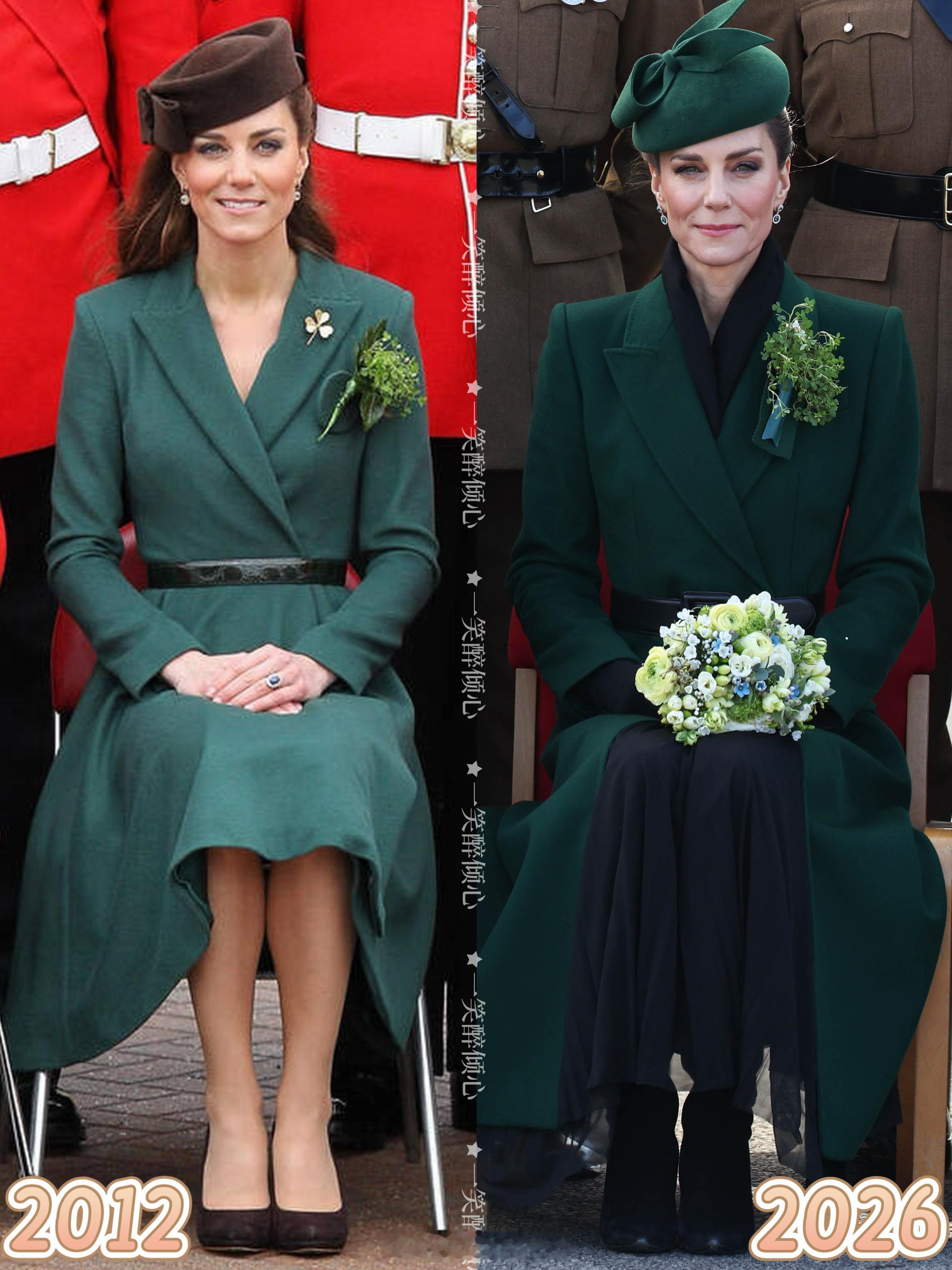 2012➡️20262012年3月17日,剑桥公爵夫人凯瑟琳代表她的丈夫剑桥公爵威廉王子在奥尔德肖特蒙斯兵营参加爱尔兰团一年一度圣帕特里克节游行☘️那次是凯瑟琳王储妃嫁入王室以来【首次】参加军事活动,就这样到现在庆祝了十多年圣帕特里克节。