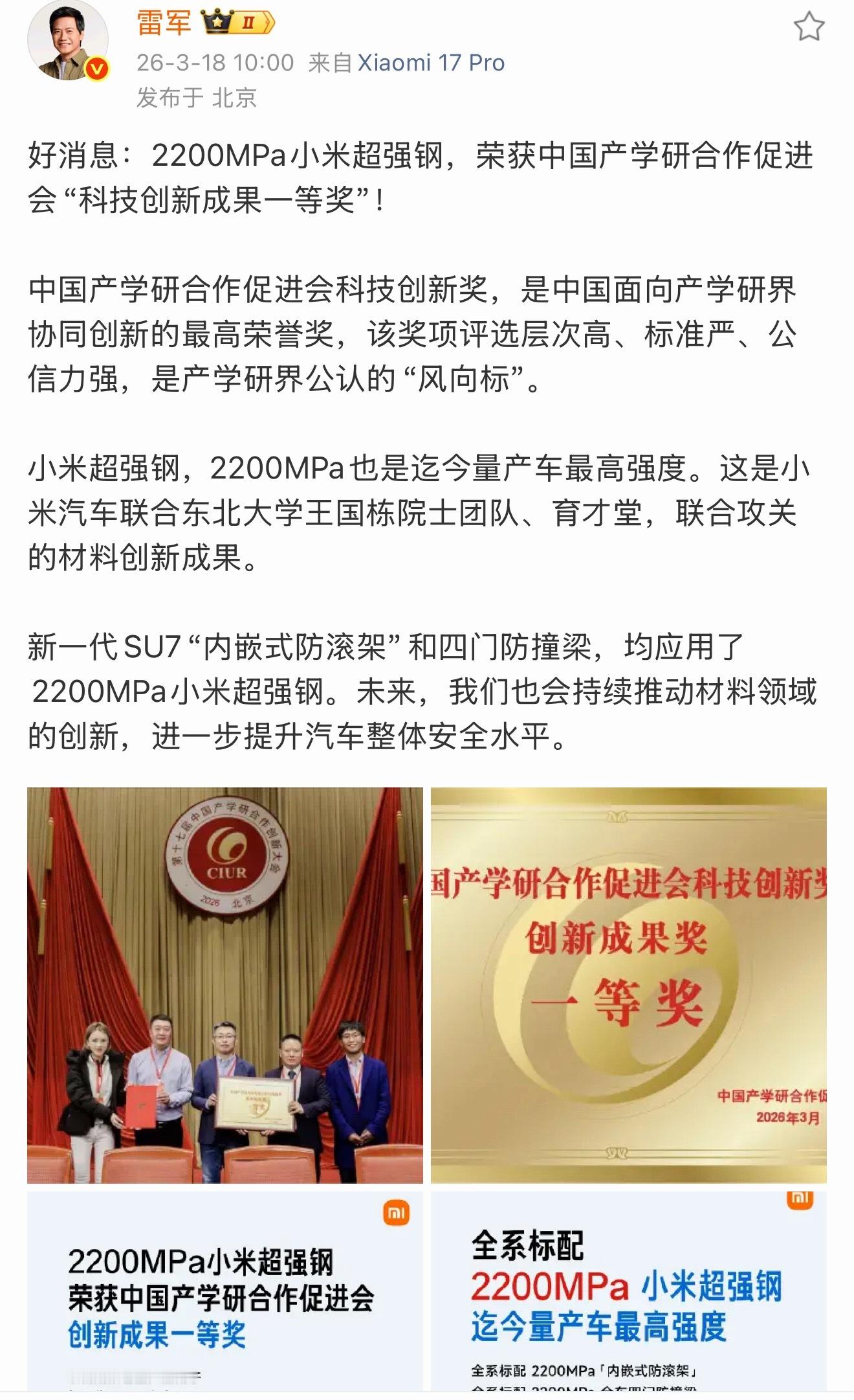 小米超强钢获得国家级科技一等奖2200MPa小米超强钢拿下中国产学研合作促进会“科技创新成果一等奖”,这不只是一个奖,还有材料界的认可和“国家级风向标”的加持。2200MPa,量产车最高强度,已经不是一句“高强”能概括,比主流水平高出40%的抗拉强度、24%的屈服强度,关键是小米联合东北大学王国栋院士团队、育材堂,用AI模型从2443万种配方里挑出最优解,打通了高强度和韧性之间的那道坎,还拿下中美欧日韩多国专利,真正把“关键材料要掌握在自己手里”做到位了。
